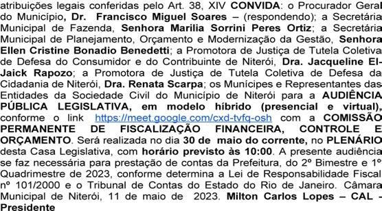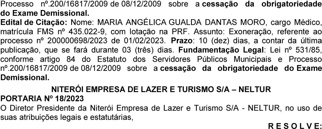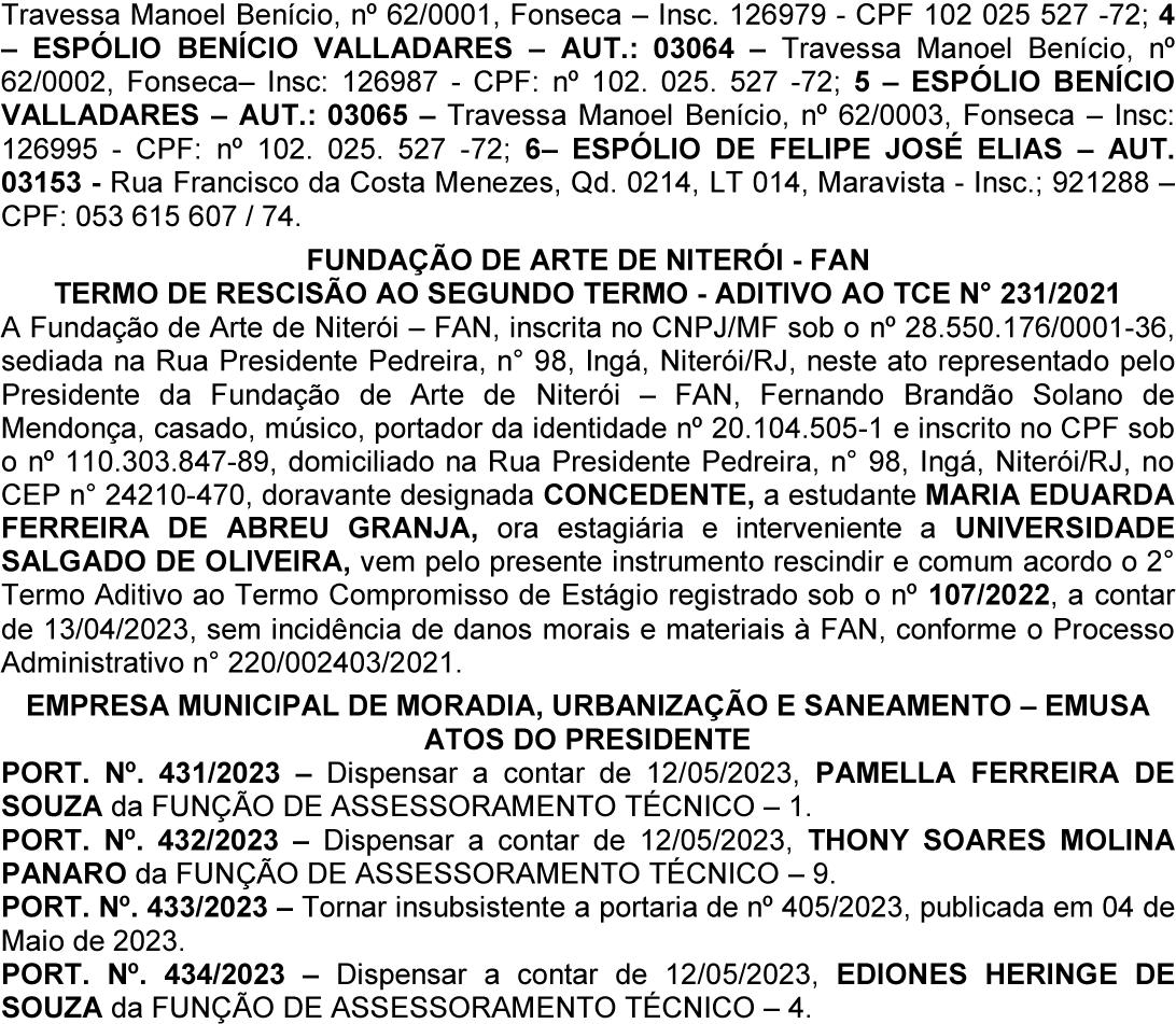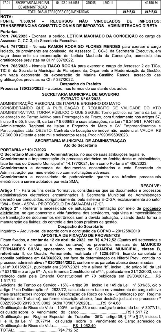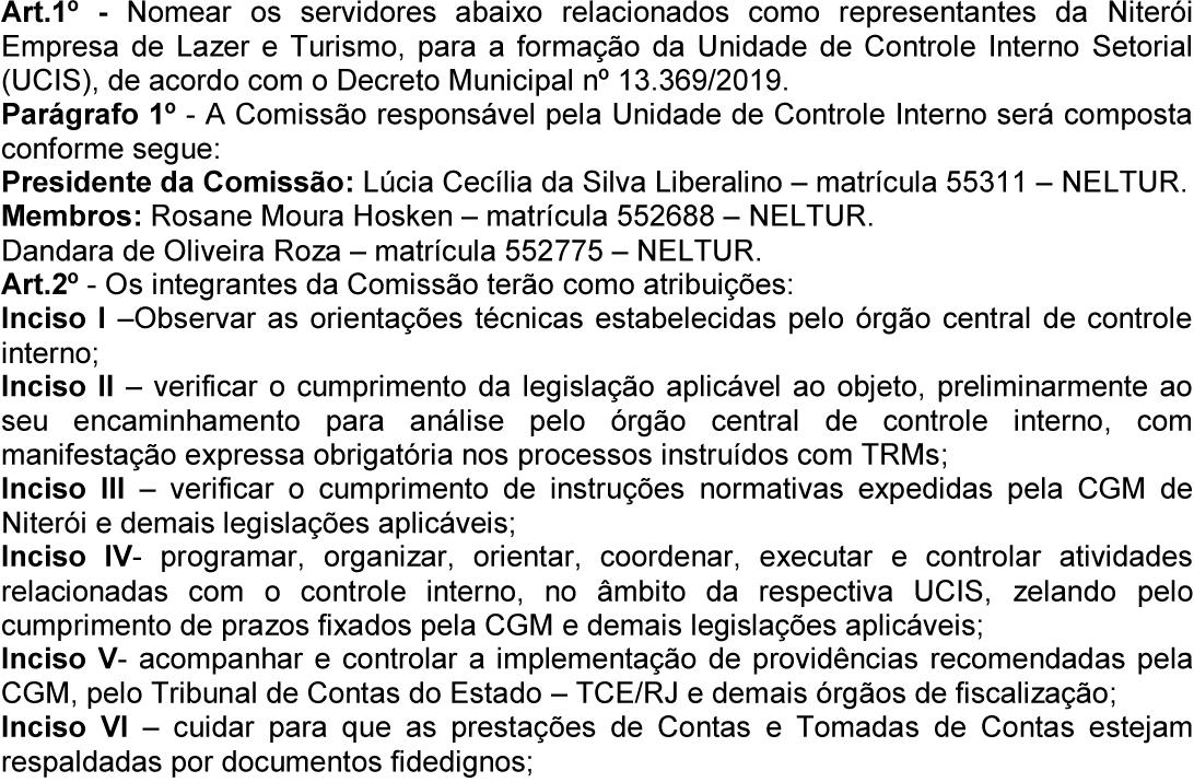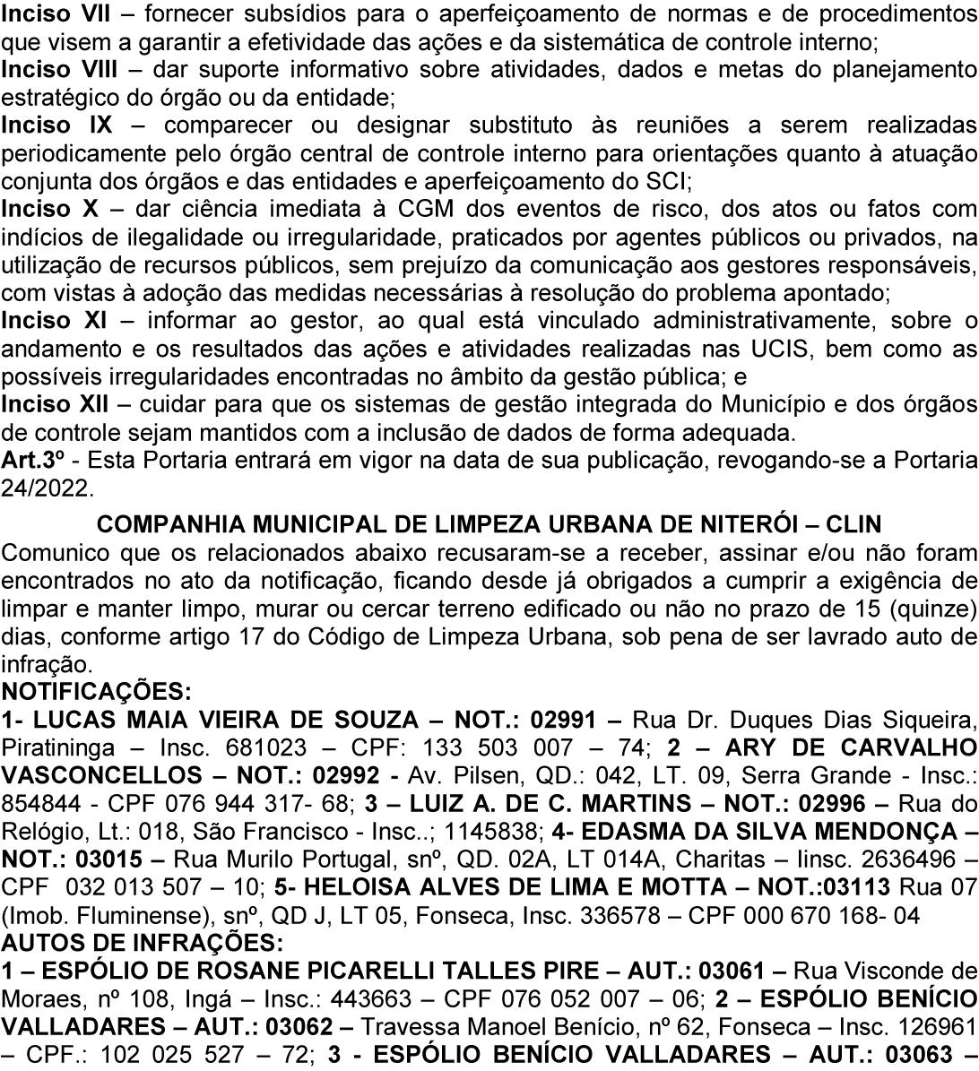 Monique Guimarães Antunes - Sec. Mun. de Des. Urbano e Habitação; Elcinei Vieira Rocha - Procuradoria Geral do Município; Andréa Vial Gonçalves Moura - Sec. Mun. de Educação; Átila Júnior Ferreira Guimarães - Sec. Mun. de Assistência Social; Deise Maria de Alcântara - Sec. Mun. de Meio Ambiente; Fernanda Fonseca Coutinho - Sec. Mun. de Saúde; Marcele Soares Mendonça - Sec. Mun. de Obras e Serviços Públicos; Eleilton Lacerda Figueiredo - Coordenadoria Municipal de Defesa Civil. Art. 3º - Fica revogada a Portaria nº 1319/2022 de 30/05/2022. Registre-se e Publique-se. Prefeitura Municipal de Rio Bonito, 09 de maio de 2023. LEANDRO PEREIRA NETTO PREFEITO MUNICIPAL