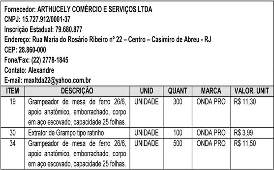A Prefeitura Municipal de Rio Bonito, em cumprimento ao disposto no § 2º do art. 15 da Lei Federal n.º 8.666/93 c/c art. 10 do Decreto Municipal nº. 169/ 2005, torna público o EXTRATO DA ATA DE REGISTRO DE PREÇOS, do material abaixo relacionado, com suas especificações, preços e fornecedor.