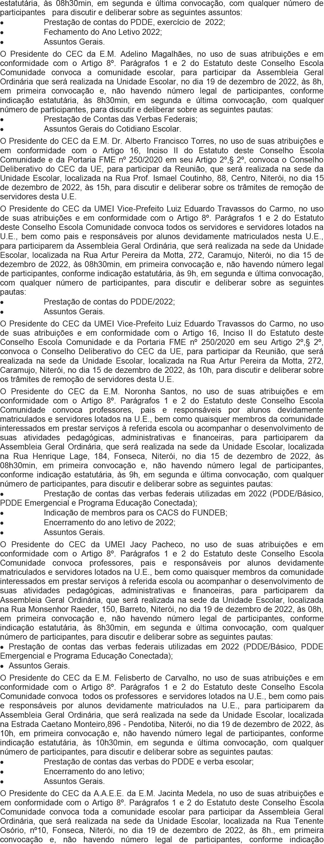 QUINTA-FEIRA, 15 DE DEZEMBRO DE 2022 17 Ficam os associados efetivos, beneméritos e remidos, no gozo dos direitos previstos no artigo 15 dos Estatutos da AFEA, convocados para a A.G.E. a ser realizada em sua sede administrativa, sito à Av. Roberto Silveira, 245 – Icaraí – Niterói, às 19:00h do dia 21 de dezembro de 2022 em 1ª convocação e às 19:30h em 2ª convocação, para deliberarem sobre a definição do processo eleitoral que organizará as eleições para Conselheiros Efetivos e Suplentes da AFEA no CREA RJ. ASSOCIAÇÃO FLUMINENSE DE ENGENHEIROS E ARQUITETOS ASSEMBLÉIA GERAL EXTRAORDINÁRIA Niterói, 15 de dezembro de 2022. Paulo Roberto Vilela Dias Presidente