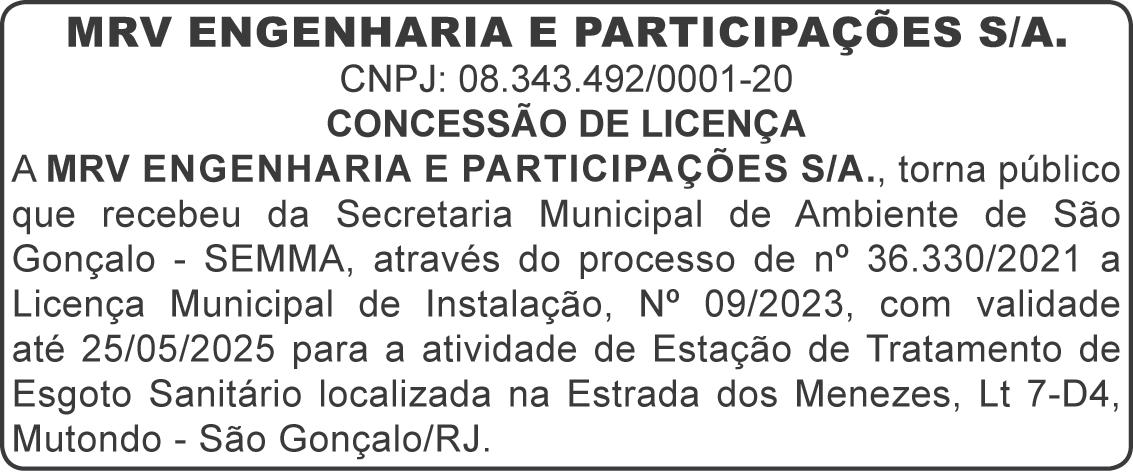 Torna público que recebeu da Secretaria de Meio Ambiente, Recursos Hídricos e Sustentabilidade, a Licença Ambiental Municipal de Instalação de número 018/2023 com validade até 25 de maio de 2026, para execução de duas residências unifamiliares, na Rua Desembargador Luiz Miguel Pinaud (Antiga Rua 55) número 351 (Lote I-4), Cafubá, Niterói-RJ.