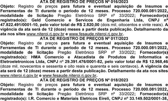 ATA DE REGISTRO DE PREÇOS Nº: 005/2021,006/2022, 007/2022, 008/ 2022 e 009/22 do PROCESSO Nº 5003/2021, PP Nº 001/2022, publicada no jornal, A Tribuna, Edição nº35.623,na data de 05/02/2022,pagina 9 e 10, mantém –se os preços registrados , de acordo com o praticado no mercado.