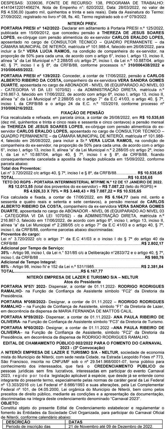 A Presidente do Instituto de Previdência dos Servidores Municipais de Rio Bonito, Estado do Rio de Janeiro, usando das atribuições que lhe são conferidas pela Lei nº 2126/2016 com alterações promovidas pela Lei nº 2483/ 2022 e Decreto nº 194 de 02/06/2022, tendo em vista os novos documentos inseridos no Processo nº 135 de 01/06/2022. Resolve, Art. 1º - PRORROGAR o benefício de pensão por morte, que passará a vigorar no período de 31/10/2022 a 10/12/2022 , com fulcro na Lei municipal nº 2126/2016, Art. 8º, Inc. IV, para a dependente, ROBERTA DO NASCIMENTO MOURA, inscrita no CPF nº 153.386.257-50, concedido através da Portaria nº 060/2009, publicada na data de 13/03/2010, jornal A Gazeta, edição nº 345, tendo em vista ter comprovado todos os requisitos necessários para a obtenção do direito a extensão do prazo de recebimento de seu benefício, que corresponderá ao valor atualizado de R$ 1.336,66 (um mil, trezentos e trinta e seis reais e sessenta e seis centavos) mensais, referente a cota de 50% do valor global do benefício.