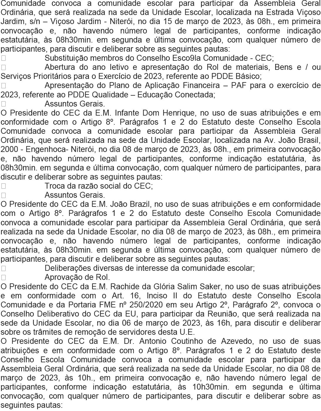 EDITAL DE CONVOCAÇÃO CMDCA-RB 001/2023. O Presidente do Conselho Municipal dos Direitos da Criança e do Adolescente de Rio Bonito - CMDCA, no uso de suas atribuições que lhe conferem a Lei Federal nº 8069/90 - ECA, Lei Municipal 377 de 02 de abril de 1992 e da Resolução CONANDA nº 105 de 15 de junho de 2005; CONSIDERANDO a preservação dos direitos trabalhistas dos conselheiros tutelares do Município de Rio Bonito;