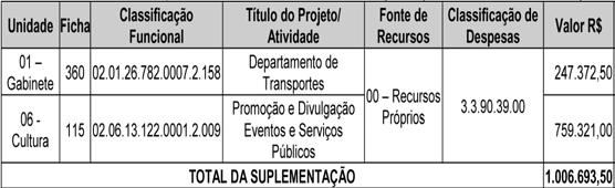 Art. 1º Ficam abertos pelo Poder Executivo, os Créditos Adicionais Suplementares, no valor de R$ 1.006.693,50 (Um Milhão, Seis Mil, Seiscentos e Noventa e Três Reais e Cinquenta Centavos), para atender despesas da Chefia de Gabinete e da Secretaria Municipal de Cultura e Turismo, através das dotações orçamentárias relacionadas a seguir: