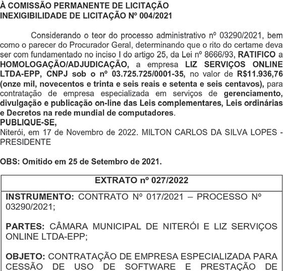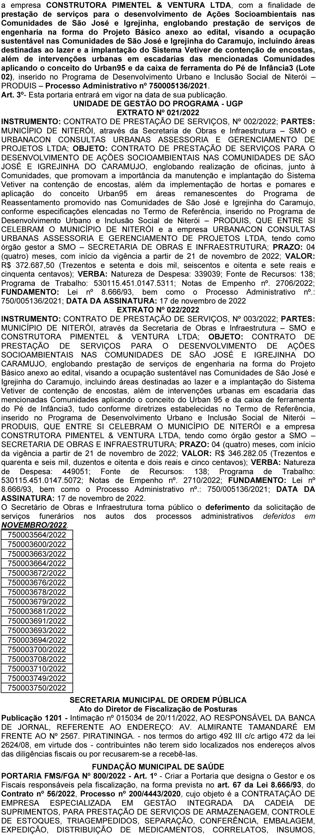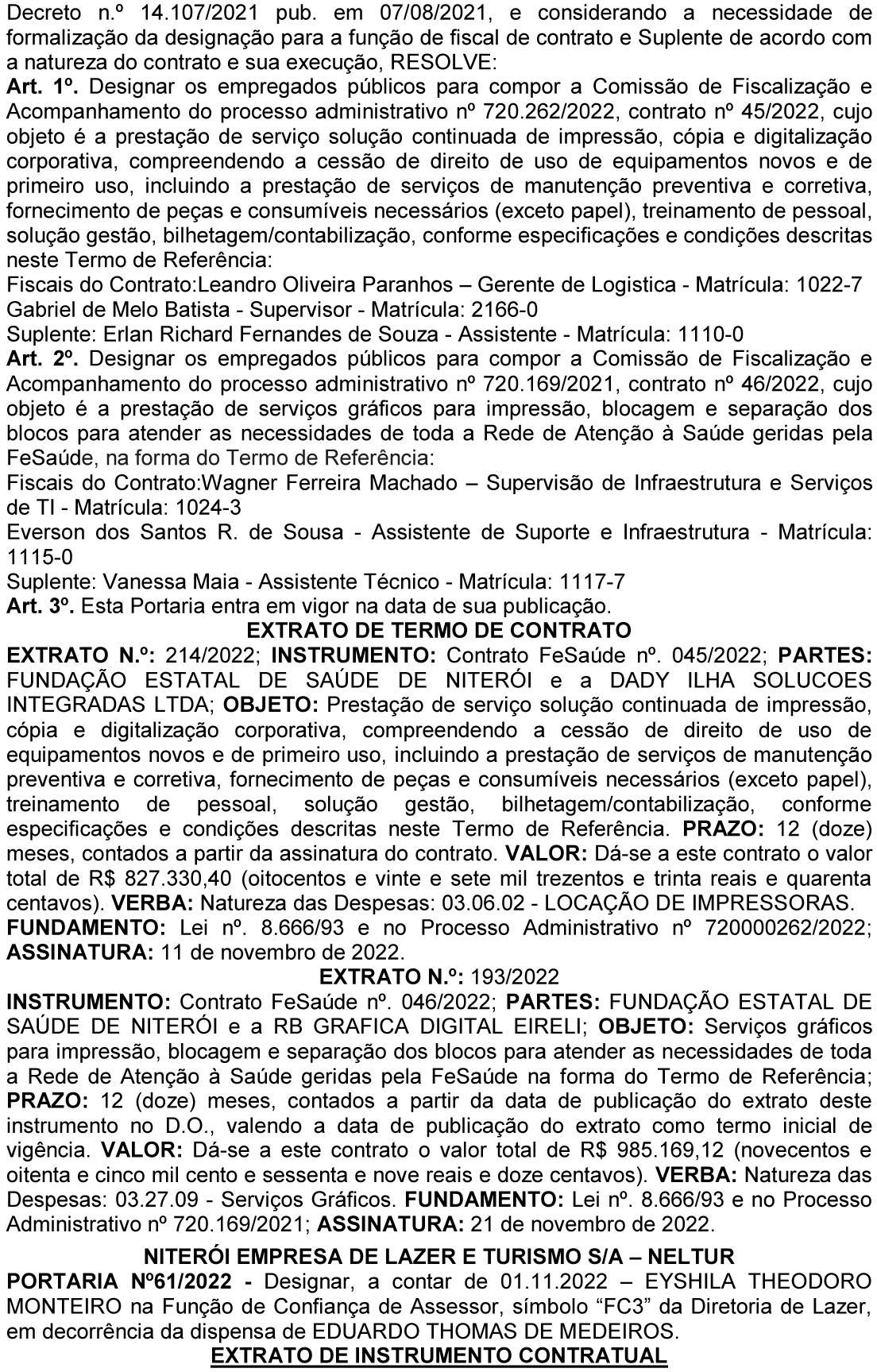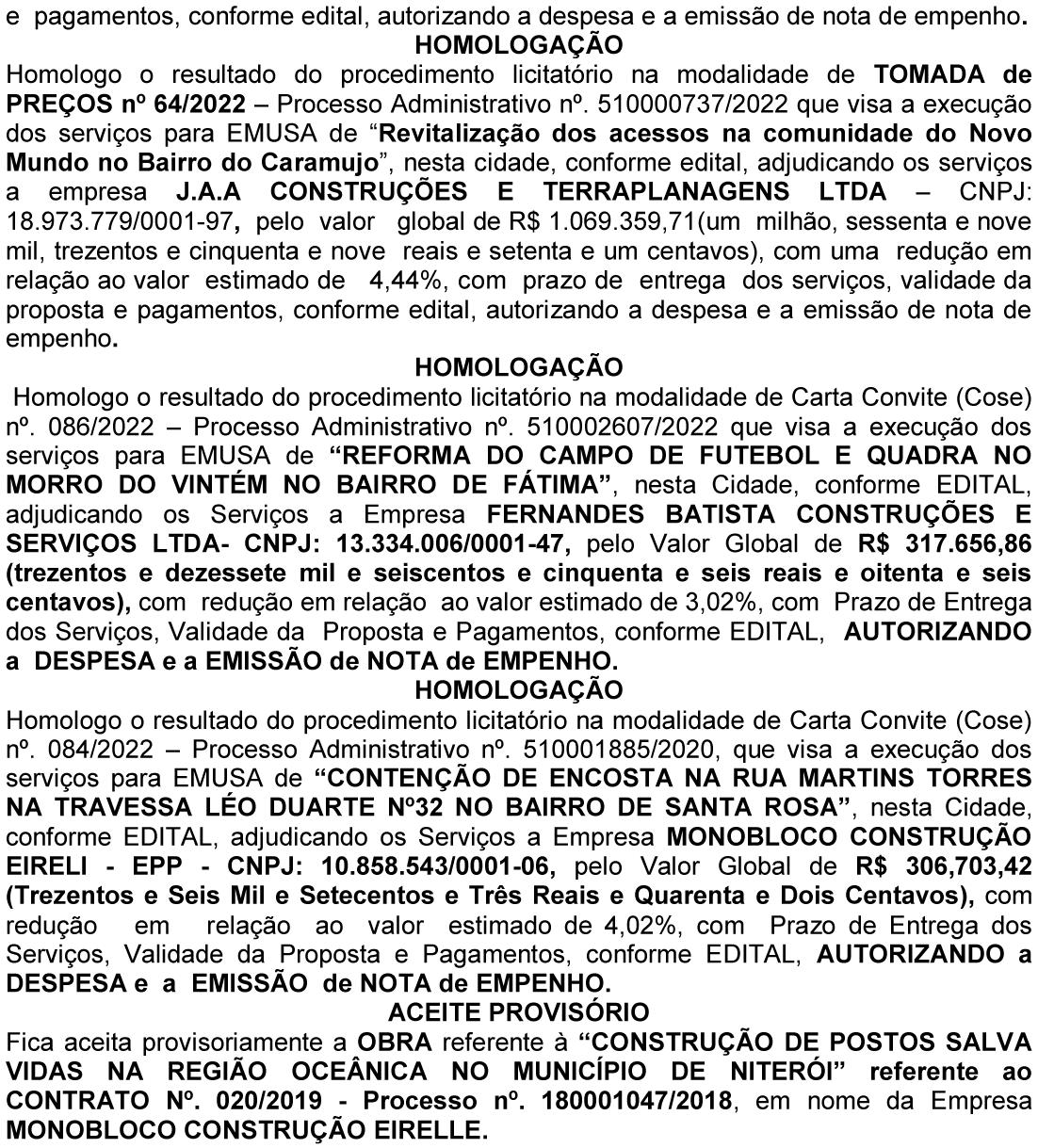 al nº 065/2022, Processo 4665/2021, cujo objeto é a Contratação de empresa especializado para fornecimento de uniforme . Propostas e Documentações serão recebidas e abertas no dia 02/12/2022 às 09:00 horas no Prédio do Centro Administrativo, Bloco B, sito à Rua Ramira Schueller nº 10 – Retiro Schueller – Rio Bonito – RJ. O Edital completo será obtido no endereço acima citado a partir de sua publicação. Custo do Edital: 1 resma de papel A4. Outras informações poderão ser obtidas também no endereço supra, ou pelo telefone (021) 2734-0276 Ramal 2131, diariamente das 10:00 às 16:00 horas.
