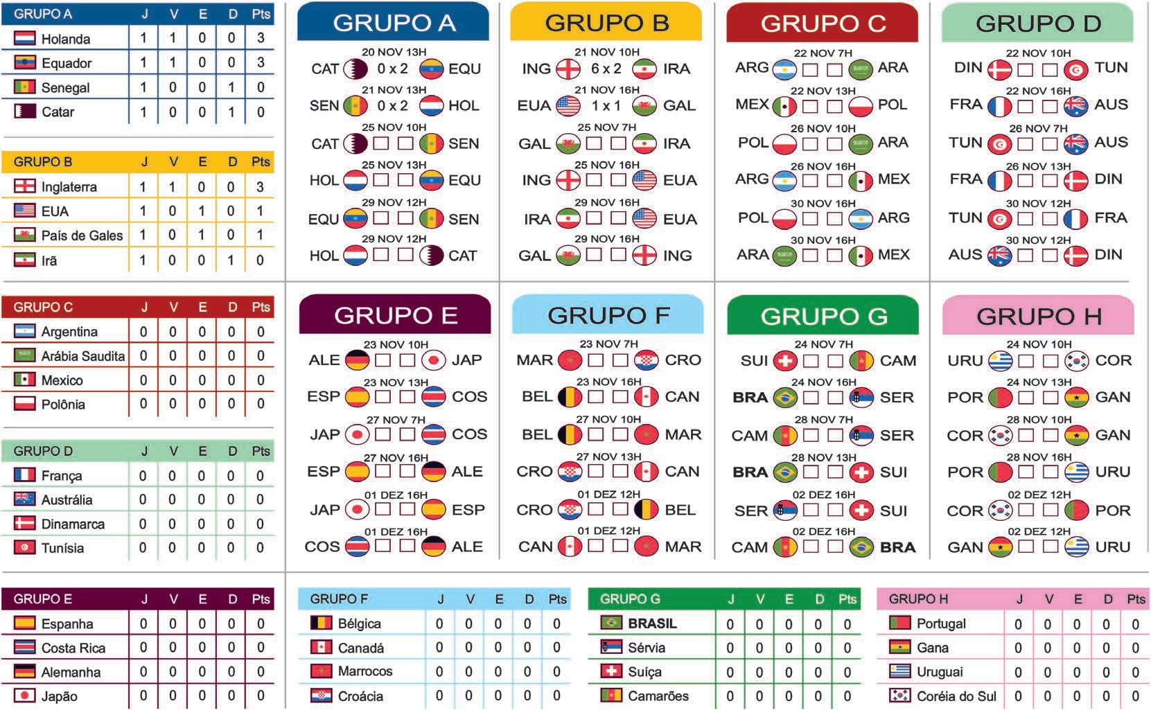 A Seleção Brasileira está no Grupo G e enfrenta a Sérvia às 16h (horário de Brasília), no Estádio Lusail pela estreia da Copa do Mundo do Catar. Um pouco antes, Suiça e Camarões medem forças. Apenas dois de cada grupo se classificam às oitavas de final.