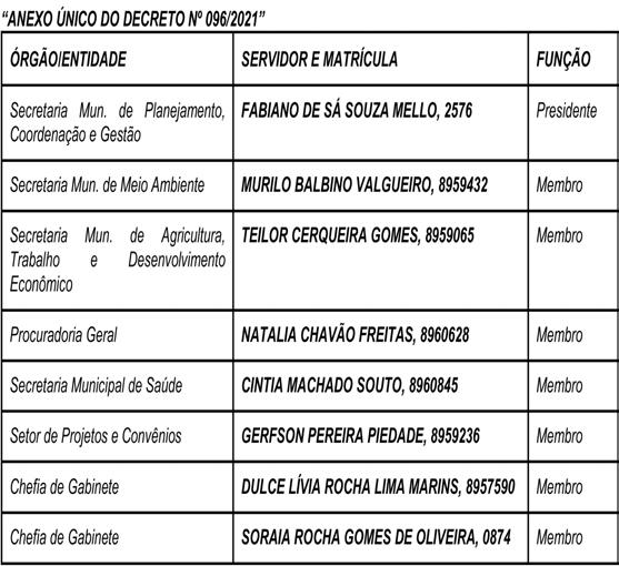 Art. 1º O Anexo Único do Decreto Nº 096, de 08 de setembro de 2021 passa a vigorar com a seguinte redação: