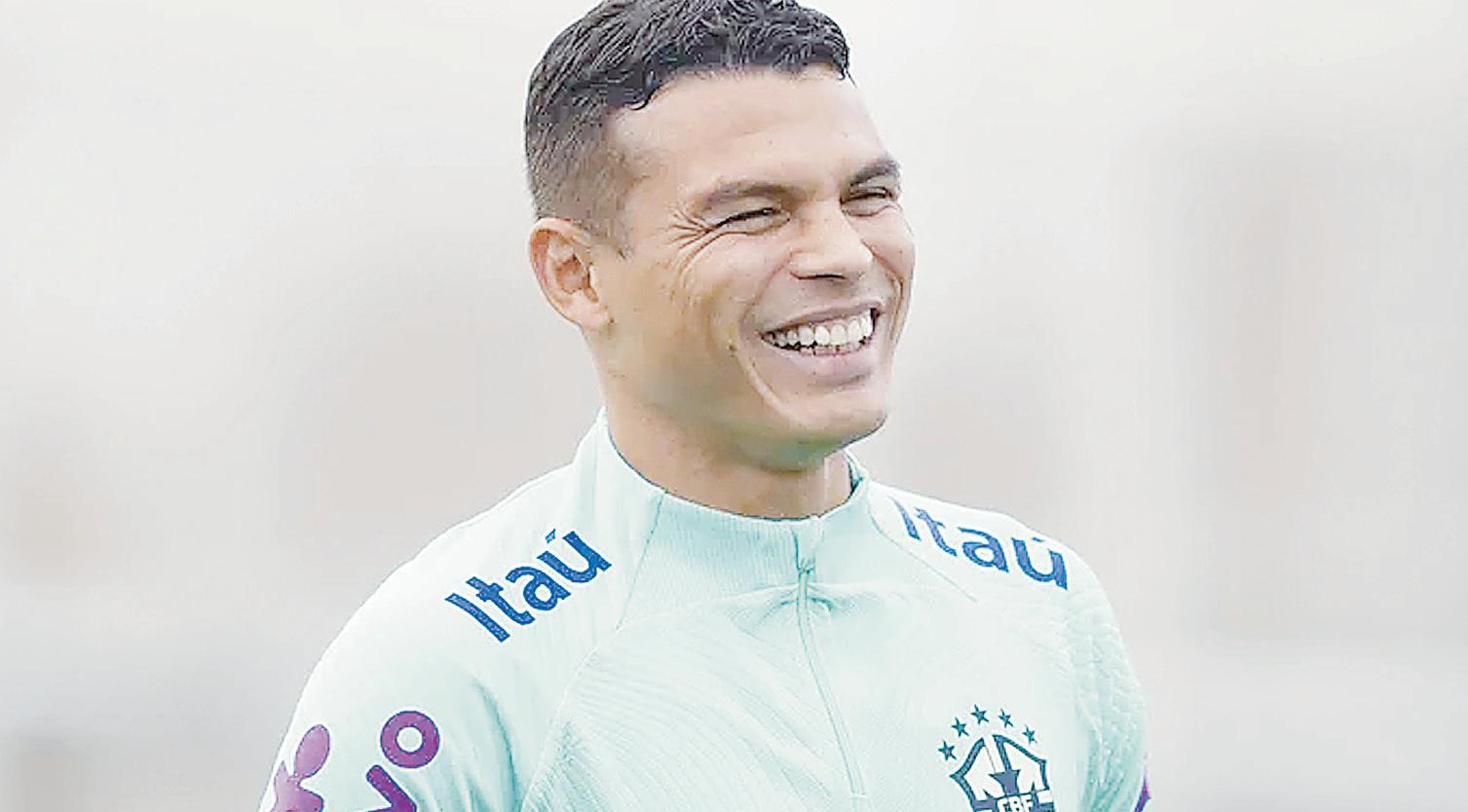 COM A BRAÇADEIRA de capitão confirmada, o zagueiro Thiago Silva era só sorrisos no treino da Seleção no Centro de Treinamento