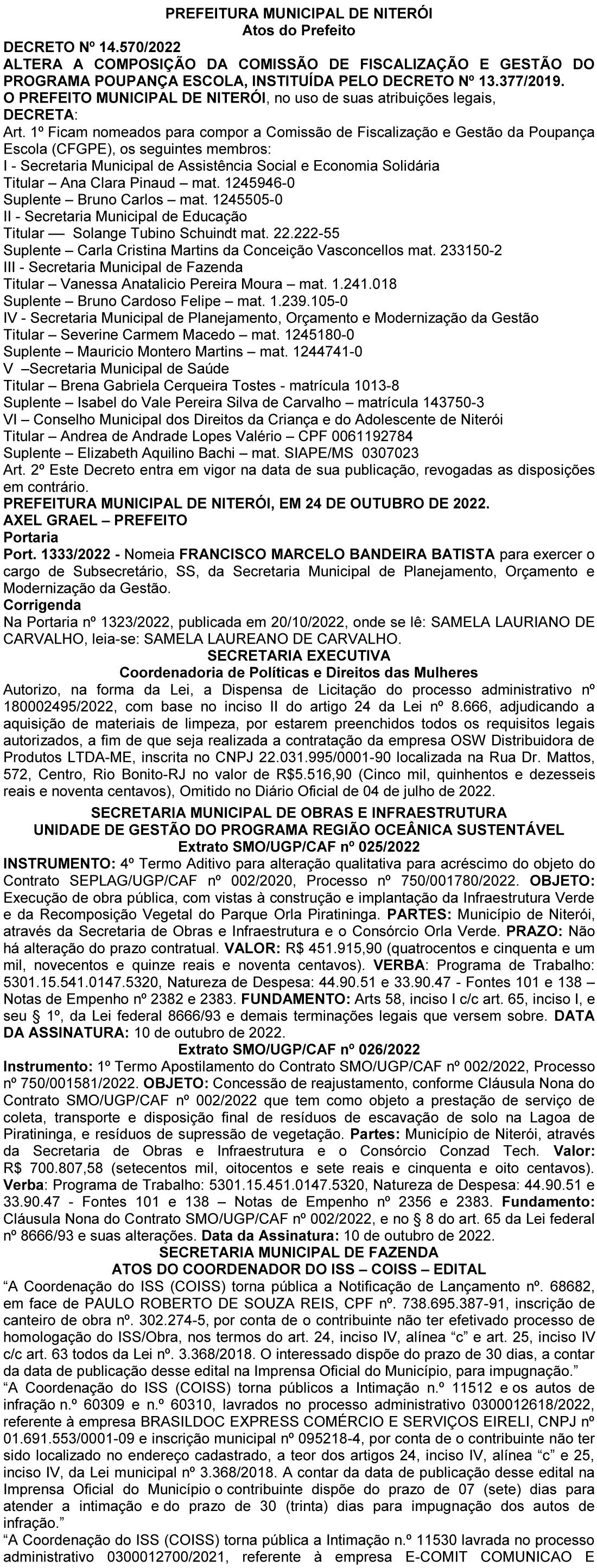 ERRATA DO CONTRATO SME Nº 111/2022, PUBLICADO NO JORNAL A TRIBUNA, EDIÇÃO Nº 35.785 DE 21/10/2022, PÁGINA 09