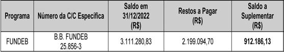 Art. 2º Os recursos para atender a presente abertura de créditos, são provenientes de saldos financeiros apurados em 31 de dezembro de 2022, em conformidade com o disposto no inciso I, parágrafo 1º, artigo 43 da Lei Federal nº. 4.320/64, oriundos do Ministério da Educação – MEC por meio do Fundo Nacional de Desenvolvimento da Educação – FNDE, conforme detalhamento do programa a seguir: