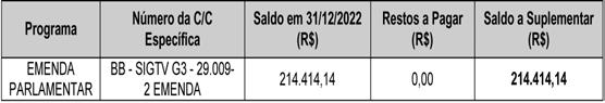 Art. 2º O recurso para atender a presente abertura de crédito, é proveniente de saldo financeiro apurado em 31 de dezembro de 2022, em conformidade com o disposto no inciso I, parágrafo 1º, artigo 43 da Lei Federal nº. 4.320/ 64, oriundo do Ministério da Cidadania por meio do Fundo Nacional de Assistência Social – FNAS, conforme detalhamento do programa a seguir: