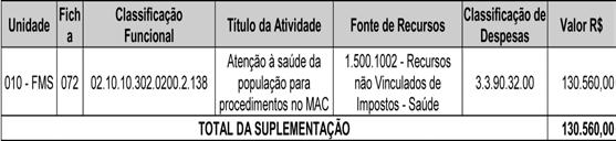 DECRETA: Art. 1º - Ficam abertos pelo Poder Executivo, os Créditos Adicionais Suplementares, no valor de R$ 2.482.663,63 (Dois Milhões, Quatrocentos e Oitenta e Dois Mil, Seiscentos e Sessenta e Três Reis e Sessenta e