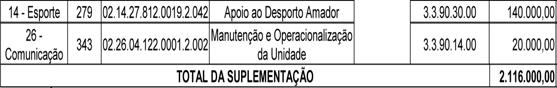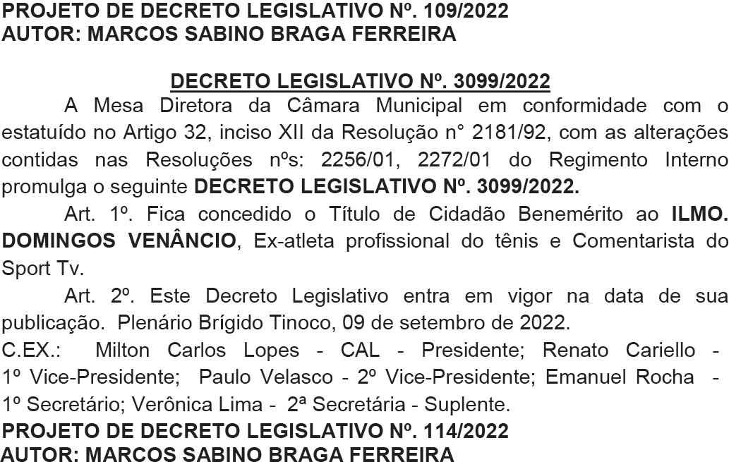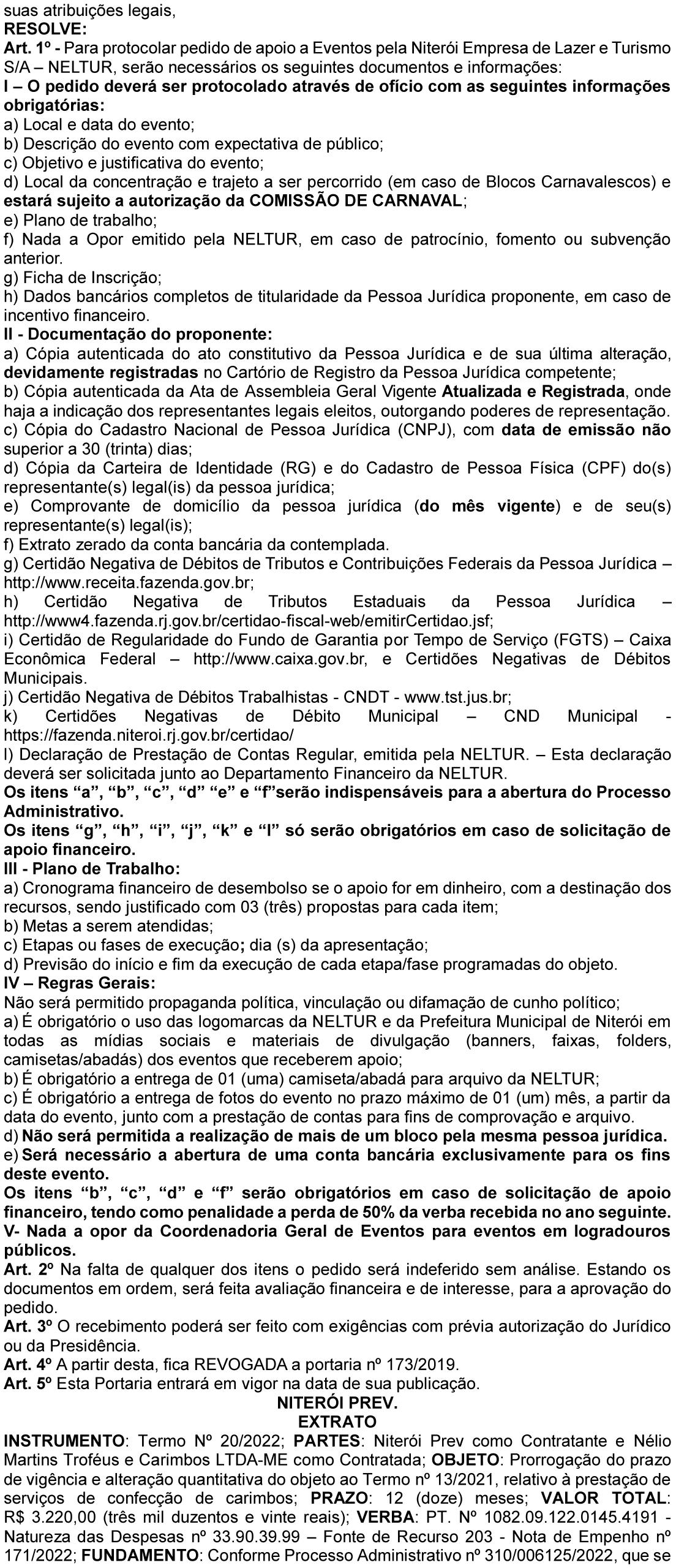 Homologo o Resultado da Licitação por Pregão Presencial nº 056/2022, cujo objeto é Registro de Preços para contratação de empresa especializada em serviço de arbitragem para atender os eventos esportivos organizados/apoiados pela Secretaria Municipal de Esporte e Lazer por um período de 12 (doze) meses, em favor das empresas: T.J.D SERVIÇOS E NEGÓCIOS COMERCIAIS EIRELI ME, classificada para os itens 1, 2, 3, 4, 5, 6, 7, 8, perfazendo o valor de R$ 145.840,00 (cento e quarenta e cinco mil oitocentos e quarenta reais);
