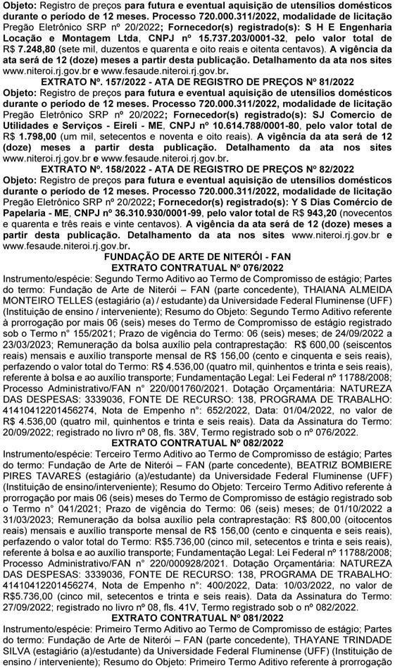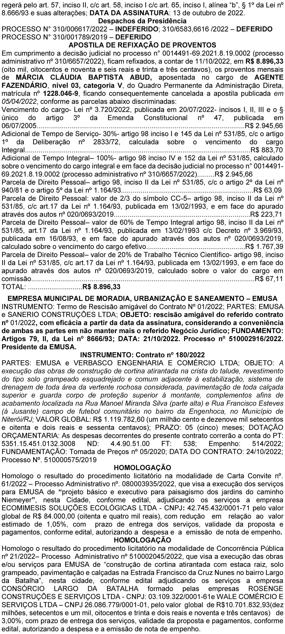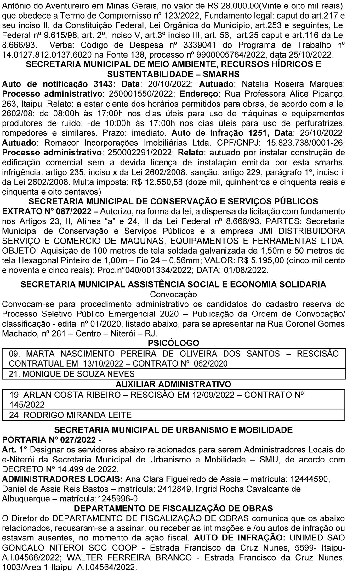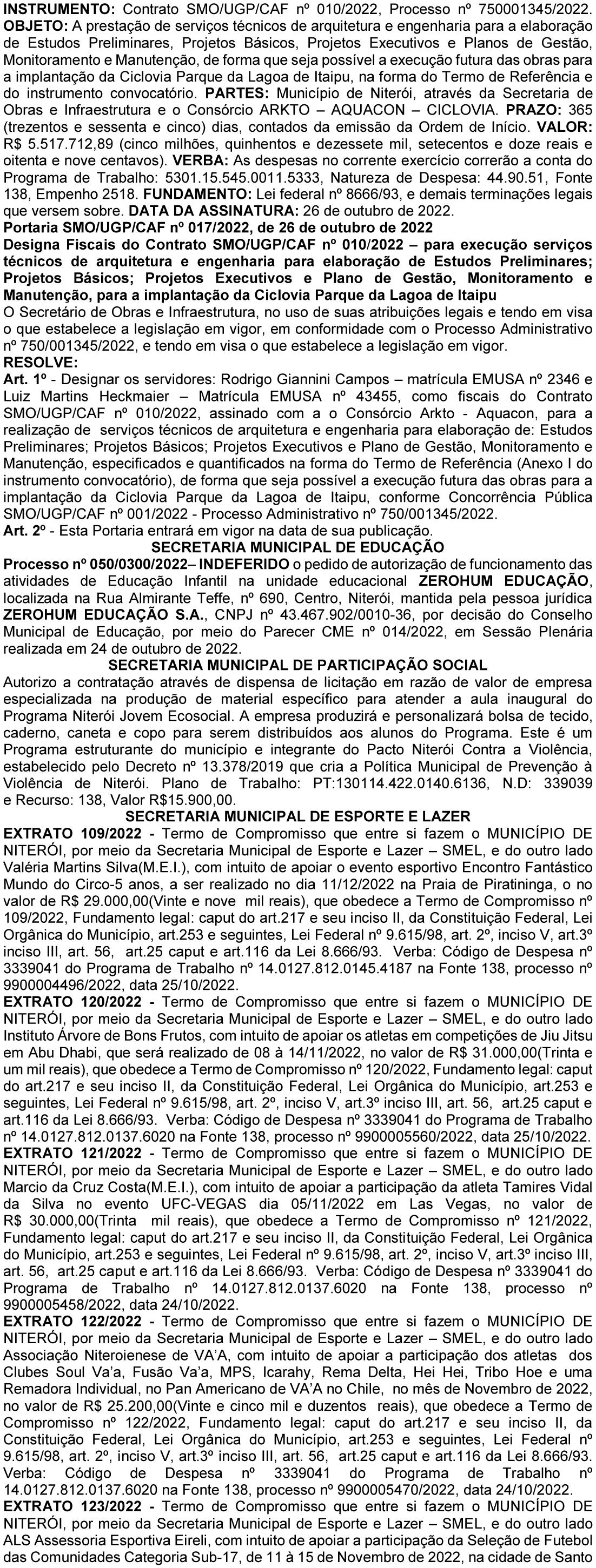 Serviço comum de Engenharia de Manutenção (preventiva e corretiva), conservação e Adequação das Unidades Escolares do Município de Rio Bonito. Valor: R$ 3.112.729,05 (três milhões, cento e doze mil, setecentos e vinte e nove reais e cinco centavos). Processo nº 321/2021 - Prazo: 12 (doze) meses. Data da assinatura: 19/10/2022.