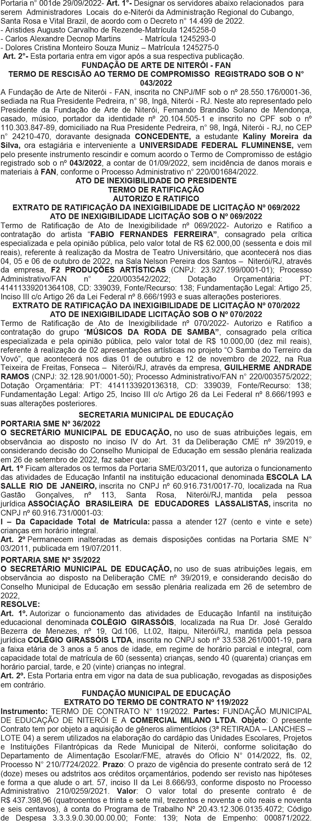 Atividades: Dispensação de medicamentos não sujeitos a controle especial; dispensação de antimicrobianos; comércio de cosméticos, perfumes produtos de higiene, correlatos, plantas medicinais e alimentos permitidos em legislação vigente. Art. 2º - Registre-se e Publique-se. Rio Bonito, 28 de setembro de 2022.