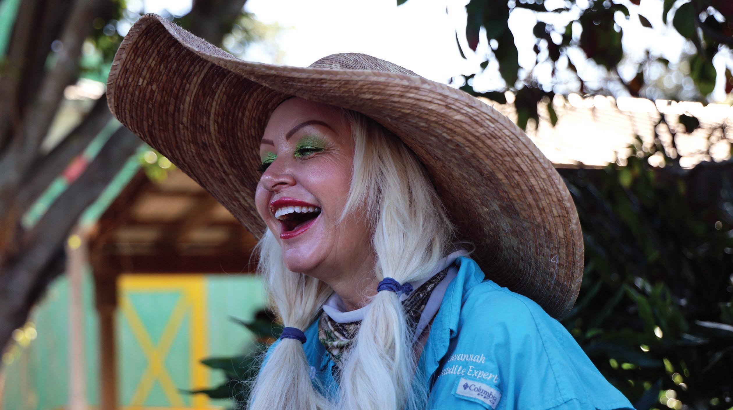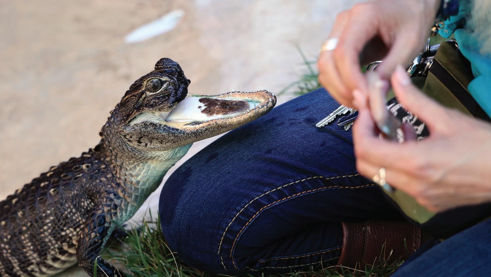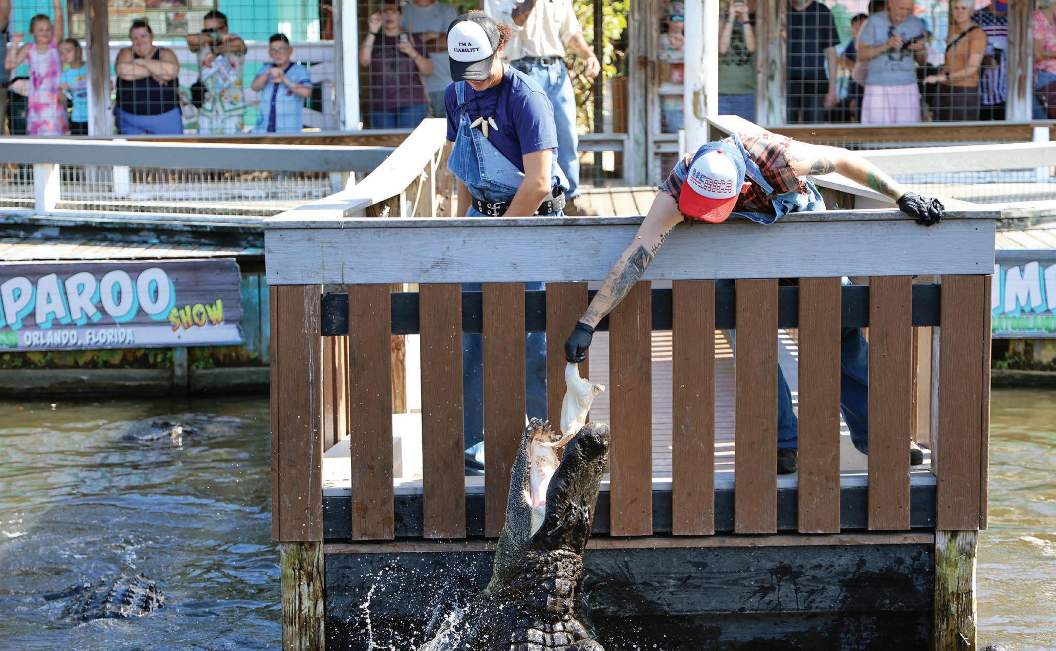 Visitors crowd around the enclosed pond as staff emerge with buckets of raw chicken, dressed in comically Southern attire and sporting even more comically fake Southern accents. They dangle the bait from a platform above the water, and alligators launch into the air to snatch it. Savannah laughs along, but just as quickly, she gently reminds a father that he can’t perch his toddler on his shoulders to watch. Care didn’t just apply to the reptiles.