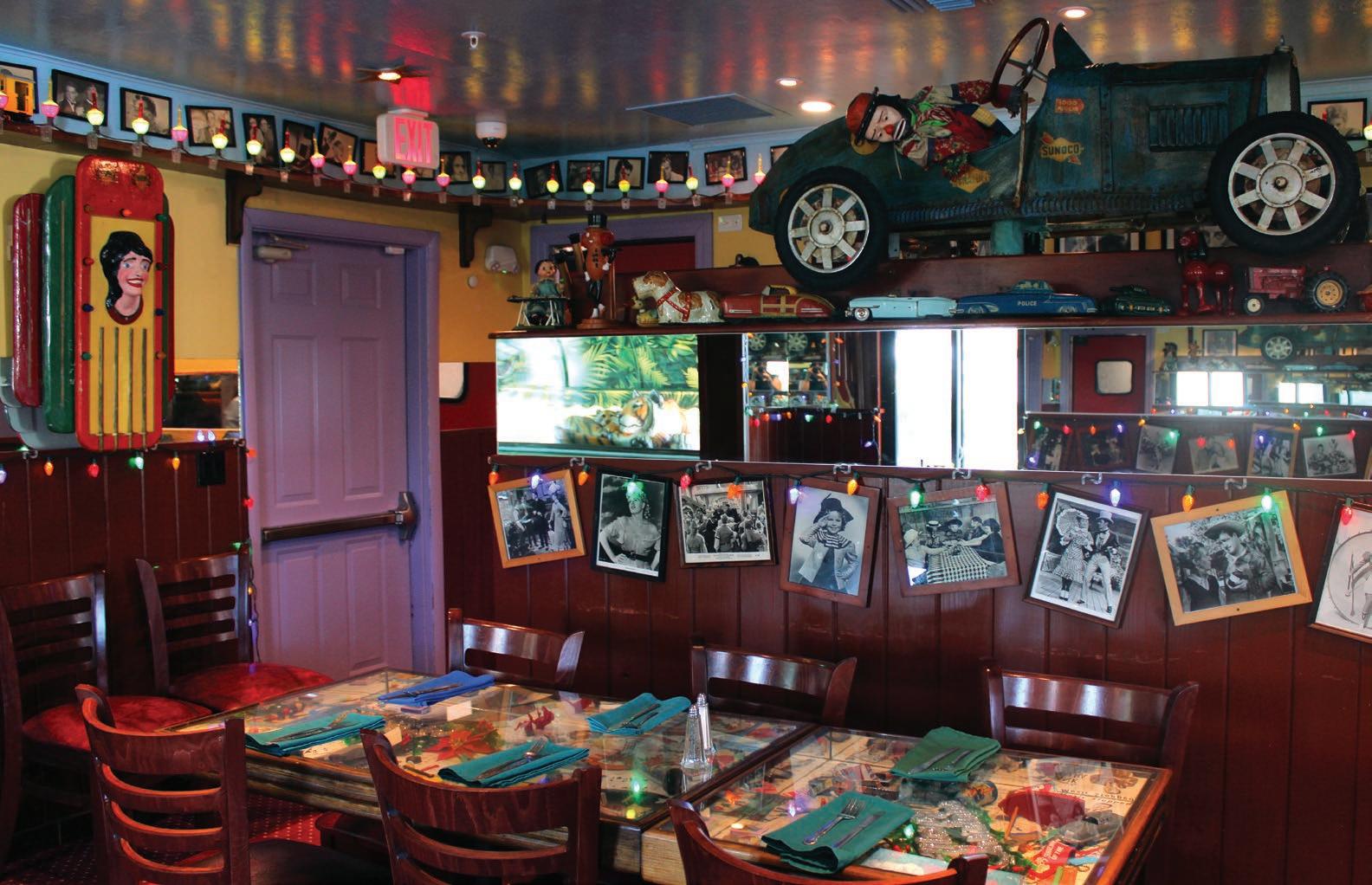 Every trip to the Bubble Room is an exciting gamble; each dining room is a different experience. A meal in the “Captain Nemo Room” is a nautical escape. Meals are shared amid colorful aquariums, with a nautilus ship from the 1954 film “20,000 Leagues Under the Sea” suspended from the ceiling. In the main dining room, guests dine under countless photographs of old Hollywood stars while a model train chugs on a track looping around the vintage memorabilia-filled walls.