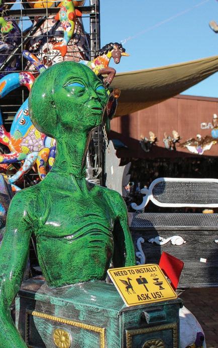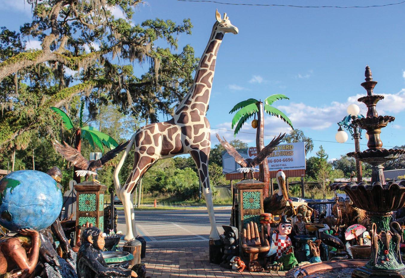 Located a few miles from the Ocala National Forest sits the Barberville Yard Art Emporium. The 3-acre plot is flooded with thousands of unique pieces ranging from mythical creatures to a 20-foot-tall giraffe, turning the heads of passersby. Upon entering the emporium, a group of funky aliens cast a warm welcome to customers.