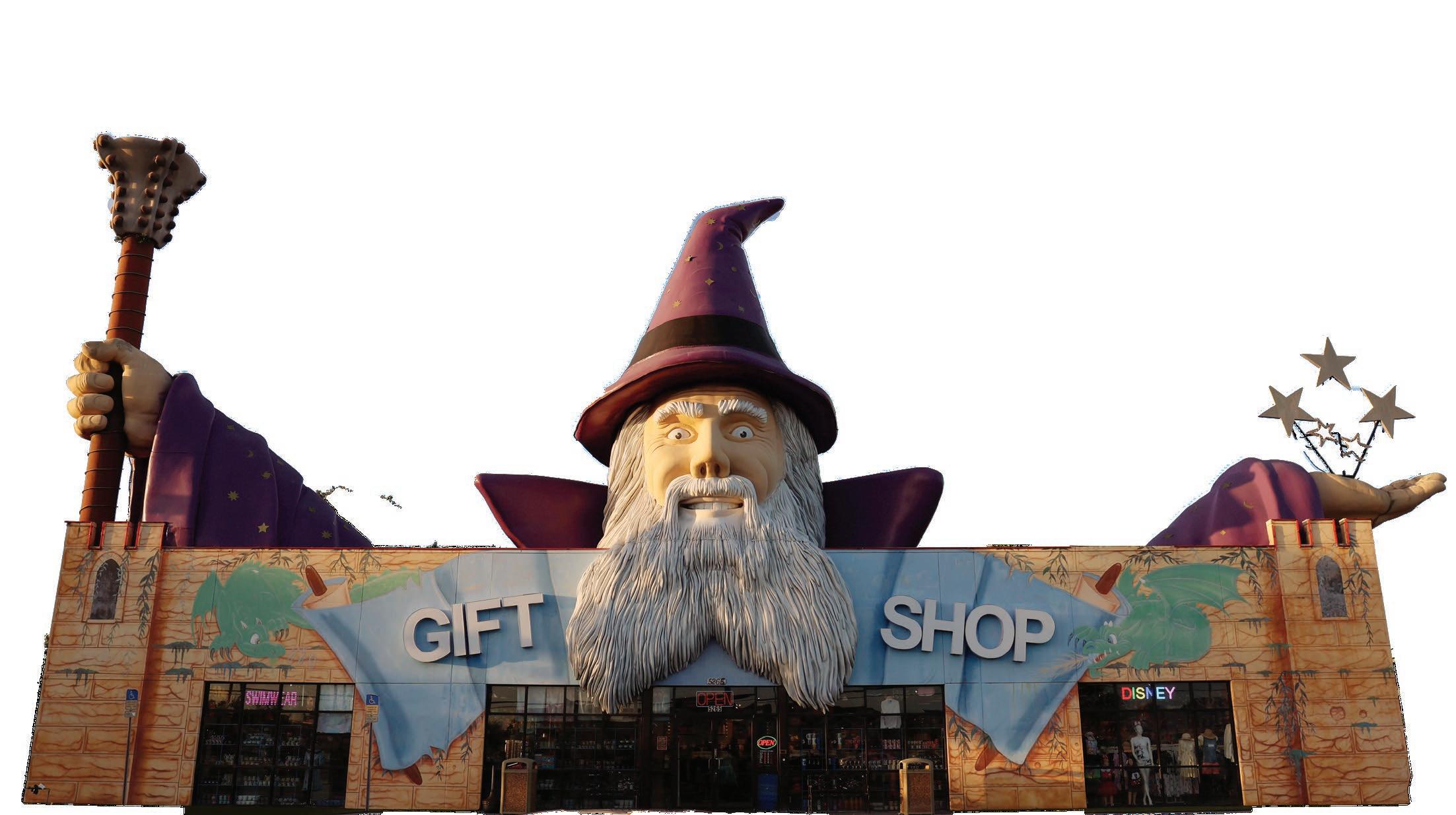 In the grand wizard’s left hand, he grasps a staff several stories tall, and a galaxy of stars hovers over the palm of his right. The kink in his purple wizard hat droops, pointing onlookers toward his purpose: to be the face of a magical gift shop. Yards of a yarn-like white beard drape over an LED “Open” sign, shining as bright as the stars he collects. He welcomes Orlando tourists and curious locals to the Jungle Falls Gift Shop –– an emporium of merchandise unlike any other.