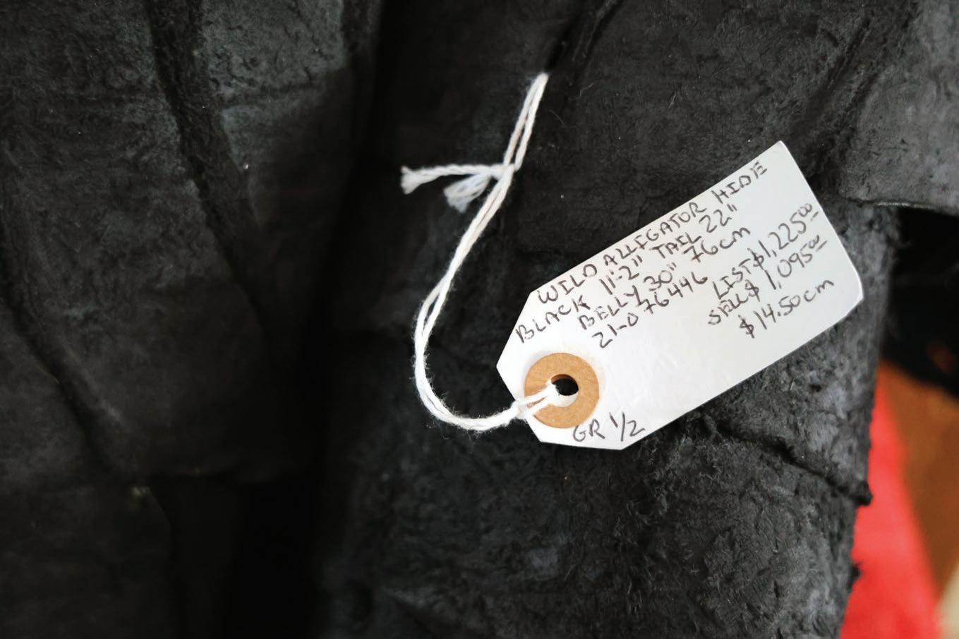 Scattered among the Confederate clutter are relics of Phil’s livelihood: gator skins. Wallets and notebooks sit in plastic bins. Dozens of speckled belts hang on hooks. Rolled-up dyed skins line the shelves.