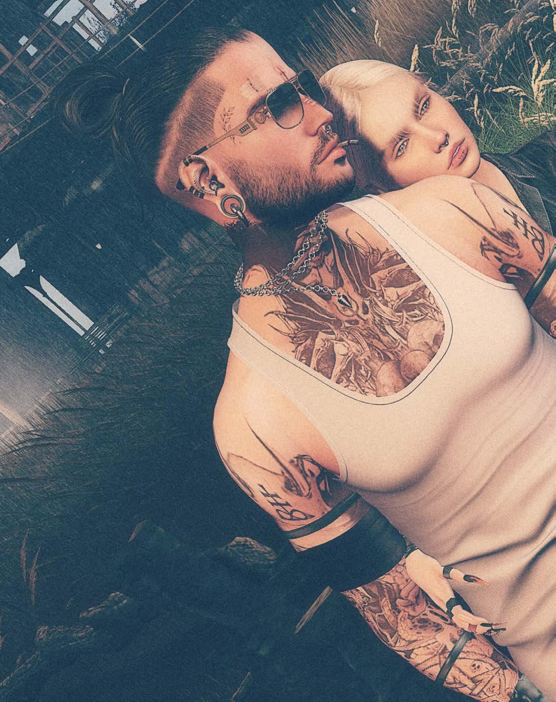 Image Three - with female model Cenit King hair: NA11 by DURA - hairbase: EGX. BOM Alejandro Hairbase Black by Eaglelux - lip tattoo: (Mix’Em) - Fuel Here by *Bolson - body hair: Body Hair by addon+ - face tattoo: Delete by RichB. - facial hair: Pavlo Facial Hair / 03 by Volkstone - glasses: Davis Eyewear by MONCADA PARIS - necklace: Xavier Necklaces by RAWR - earrings: Manas Earring by RichB. - shorts: Luke swim boxers by TOTALLY WICKED - sliders: SLAYOV_SLIDE by [ VERSOV ]bandaid: Metal Bandaid by [Dope+Mercy]