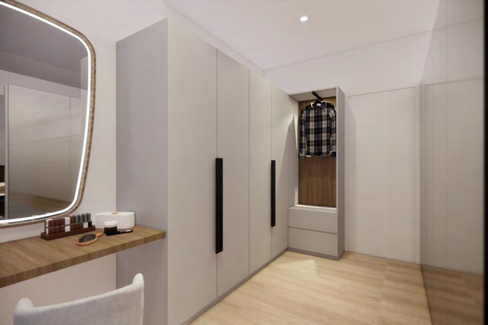 In the master bedroom, a partition wall is added to separate the sleeping area from the walk-in closet, providing a more organized and functional layout. This design choice enhances the overall sense of order while maintaining the room's open and inviting feel.