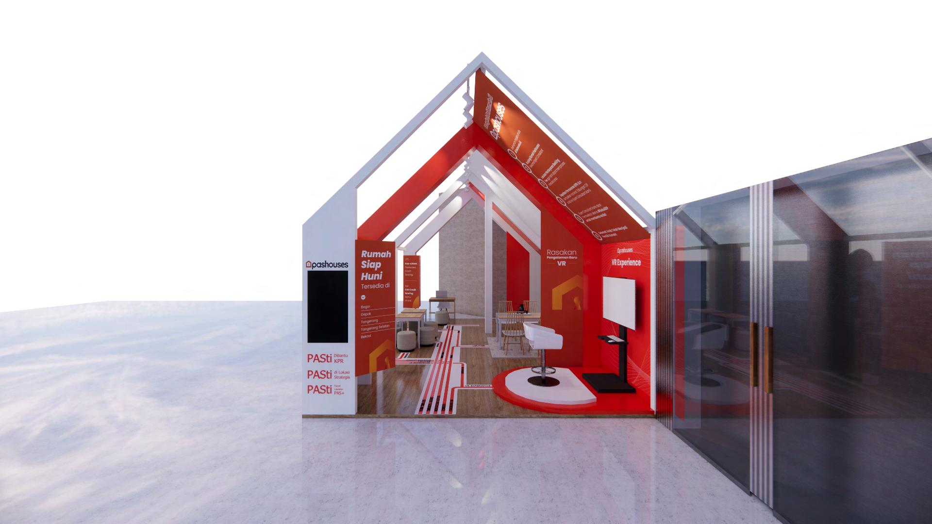 The Pashouses booth at IPEX, created in 2022 and 2023, serves as a platform to introduce the company and its properties to visitors. The design prominently features Pashouses' signature orange color and logo, with seating and tables for visitors to engage with sales representatives. Digital displays, including VR, screens, and projectors, showcase examples of Pashouses' homes, allowing visitors to explore properties interactively. The booth aims to create a welcoming and informative environment for potential customers to learn more about the company and its offerings.