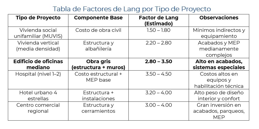 Los factores de Lang son coeficientes empíricos utilizados para estimar el costo total de un proyecto a partir del costo de un componente base, como la estructura o la obra civil. Fueron propuestos por Robert Lang como una herramienta práctica para estimar costos globales de construcción en fases tempranas de proyecto, cuando aún no se dispone de planos detallados. Su base metodológica se apoya en el análisis empírico de costos unitarios por metro cuadrado, ajustados según el tipo de edificación, nivel tecnológico, y complejidad funcional.