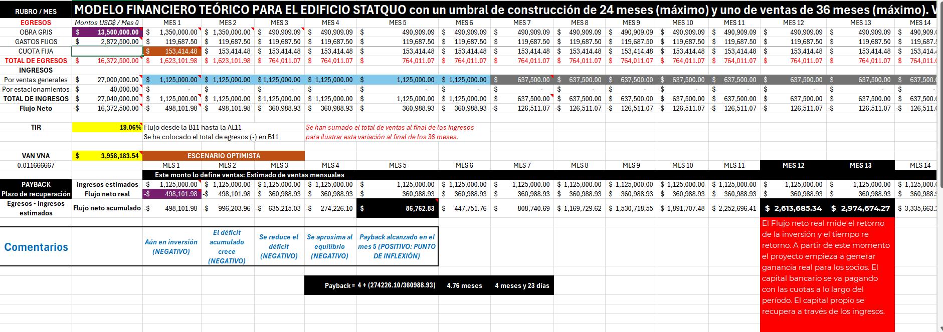 El flujo de ingresos se concentra en los primeros 36 meses, y el payback se alcanza en apenas 4.7 meses después del punto de equilibrio.