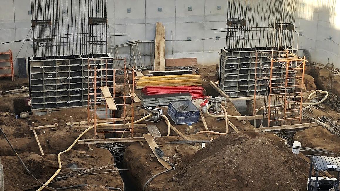 Panorámica del comienzo de un muro de corte y su armaduría de acero corrugado.