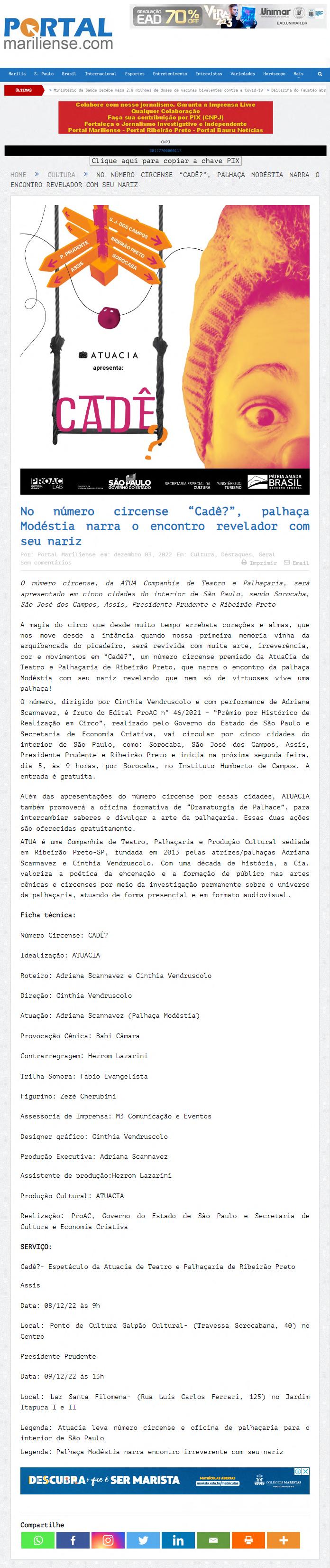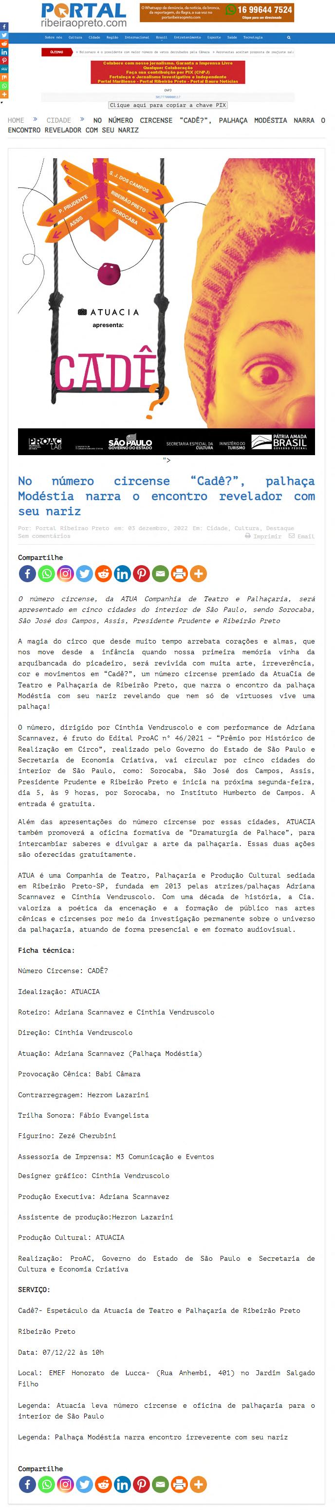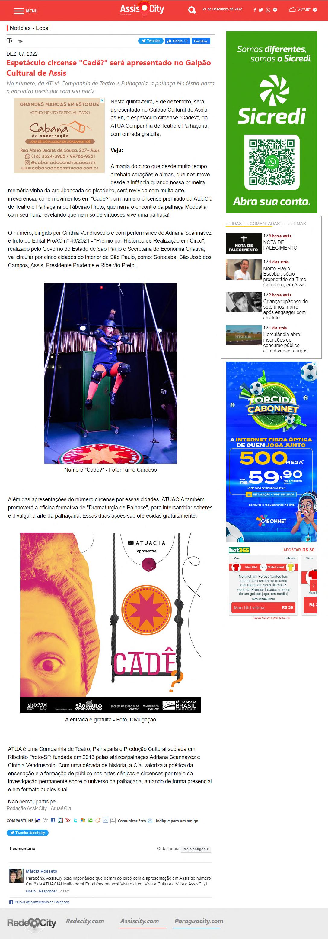 Nesta primeira temporada de apresentações, circulamos com o número CADÊ? por 5 cidades do Estado: Sorocaba, São José dos Campos, Ribeirão Preto, Assis e Presidente Prudente, oferecendo também a oficina “Dramaturgia de Palhace” como proposta de contrapartida que em cada cidade se desdobrou de forma distinta, cancelada apenas em Presidente Prudente porque na data prevista houve jogo da seleção brasileira de futebol na Copa do Mundo.