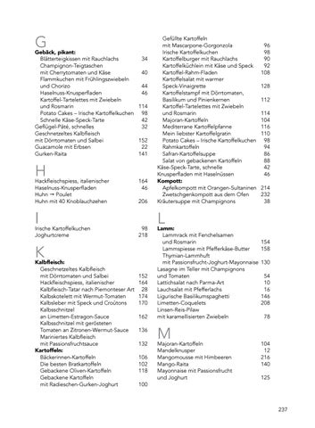 Kalbleisch: Geschnetzeltes Kalbleisch mit Dörrtomaten und Salbei Hackleischspiess, italienischer Kalbleisch-Tatar nach Piemonteser Art Kalbskotelett mit Wermut-Tomaten Kalbsleber mit Speck und Croûtons Kalbsschnitzel an Limetten-Estragon-Sauce Kalbsschnitzel mit gerösteten Tomaten an Zitronen-Wermut-Sauce Mariniertes Kalbleisch mit Passionsfruchtsauce Kartoffeln: Bäckerinnen-Kartoffeln Die besten Bratkartoffeln Gebackene Oliven-Kartoffeln Gebackene Kartoffeln mit Radieschen-Gurken-Joghurt