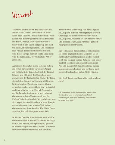 immer wieder überwältigt von dem Angebot an Antipasti, mit dem wir empfangen werden. Grundlage für die unerschöpfliche Vielfalt an Antipasti-Kreationen ist fast immer Gemüse. Und die sind so gut, dass wir meist gar kein Hauptgericht mehr wollen. Das Tolle an der italienischen Gemüseküche: Sie kennt unglaublich viele Gerichte, sie ist bunt und abwechslungsreich. Und doch sind es oft nur ein paar wenige Zutaten – von bester Qualität, topfrisch und gekonnt kombiniert. Was will man mehr? Das alles einmal zusammenfassen, aufschreiben und zu Hause nachkochen. Das Ergebnis halten Sie in Händen. Viel Spaß damit, und lassen Sie es sich schmecken!