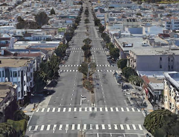 The road and light rail become a one way loop around the Geary/Point Lobos triangle in Territory 04 which allows for more greenspace within the street.