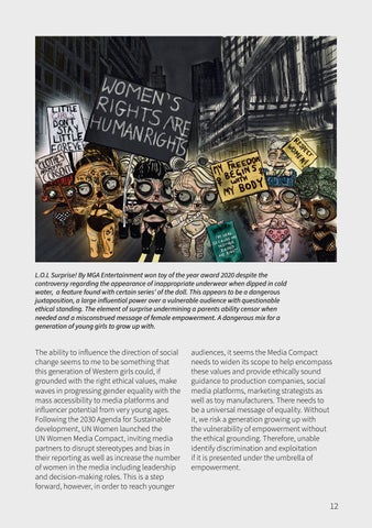 audiences, it seems the Media Compact needs to widen its scope to help encompass these values and provide ethically sound guidance to production companies, social media platforms, marketing strategists as well as toy manufacturers. There needs to be a universal message of equality. Without it, we risk a generation growing up with the vulnerability of empowerment without the ethical grounding. Therefore, unable identify discrimination and exploitation if it is presented under the umbrella of empowerment.