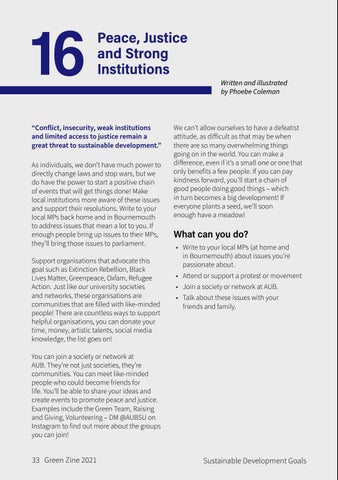 “Conflict, insecurity, weak institutions and limited access to justice remain a great threat to sustainable development.” As individuals, we don’t have much power to directly change laws and stop wars, but we do have the power to start a positive chain of events that will get things done! Make local institutions more aware of these issues and support their resolutions. Write to your local MPs back home and in Bournemouth to address issues that mean a lot to you. If enough people bring up issues to their MPs, they’ll bring those issues to parliament. Support organisations that advocate this goal such as Extinction Rebellion, Black Lives Matter, Greenpeace, Oxfam, Refugee Action. Just like our university societies and networks, these organisations are communities that are filled with like-minded people! There are countless ways to support helpful organisations, you can donate your time, money, artistic talents, social media knowledge, the list goes on!
