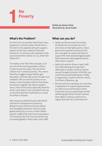 What can you do? • Speak up! Not everyone has money to donate but we can give our time and voices to help fight poverty. Check government policies and ensure that your vote goes to a party that looks to support the most disadvantaged people. Raise awareness about global poverty – information is power! • Help fund-raise for those in need. AUB has a RAG (Raising & Giving) Team dedicated to raising money for worthy causes through fun events. With RAG, you could find yourself trekking the 3 Peaks or organising a creative event for charity. Find them at @aubsu_rag • Be wise with your spending. Our economy is dependent on supporting businesses so make sure you think about which businesses you are supporting! Are their staff being paid fairly? Do their workers have rights? Could you switch out a regular food item for a Fairtrade one?