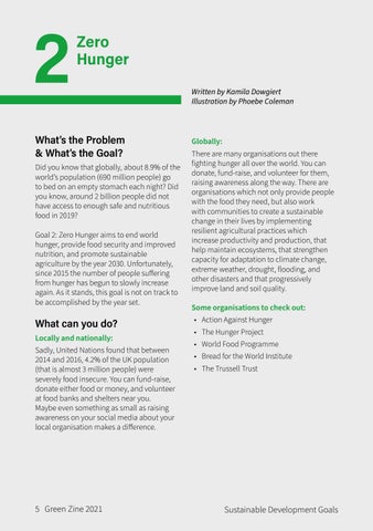 Globally: There are many organisations out there fighting hunger all over the world. You can donate, fund-raise, and volunteer for them, raising awareness along the way. There are organisations which not only provide people with the food they need, but also work with communities to create a sustainable change in their lives by implementing resilient agricultural practices which increase productivity and production, that help maintain ecosystems, that strengthen capacity for adaptation to climate change, extreme weather, drought, flooding, and other disasters and that progressively improve land and soil quality. Some organisations to check out: • Action Against Hunger • The Hunger Project • World Food Programme • Bread for the World Institute • The Trussell Trust