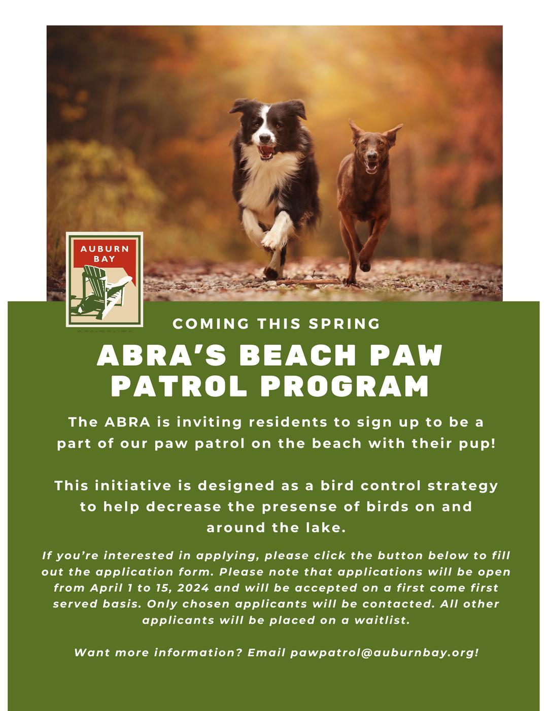 ABRAisexcitedtoannounceournewBeachPawPatrolProgram comingthisSpring!Wantyourpuptobeapartofthepawpatrol crew?Checkoutthelinkbelow