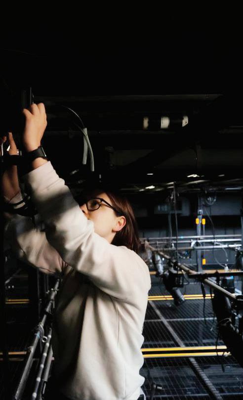 Bottom: Katie Wolfe focuses lighting instruments.