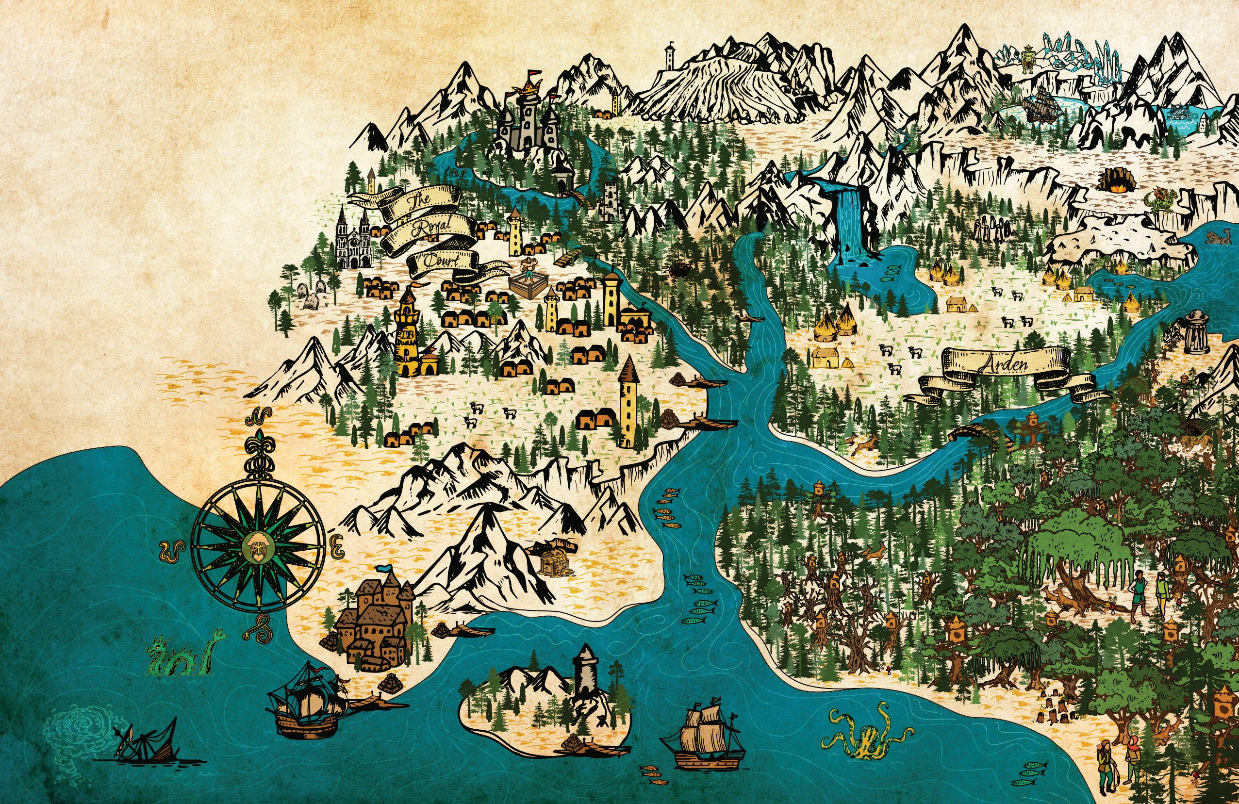 Map: An imagined map of the royal court, the forest of Arden, surrounding lands, and the edges of parts unknown.