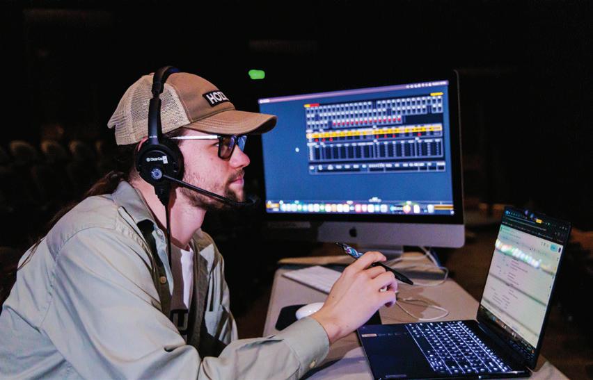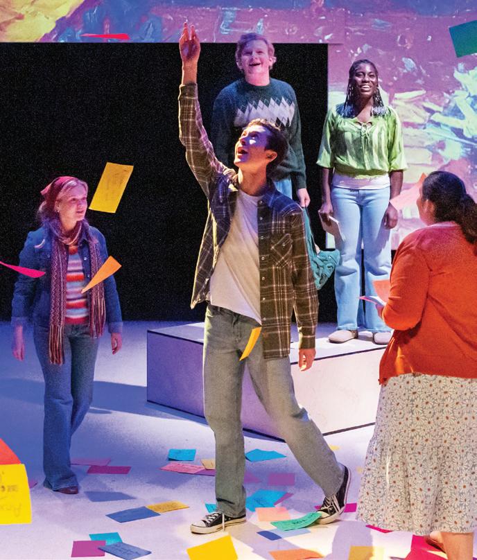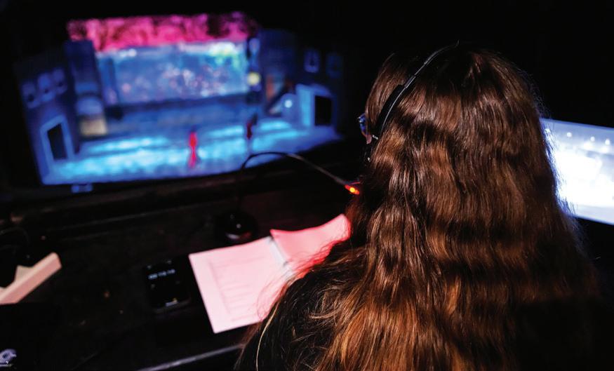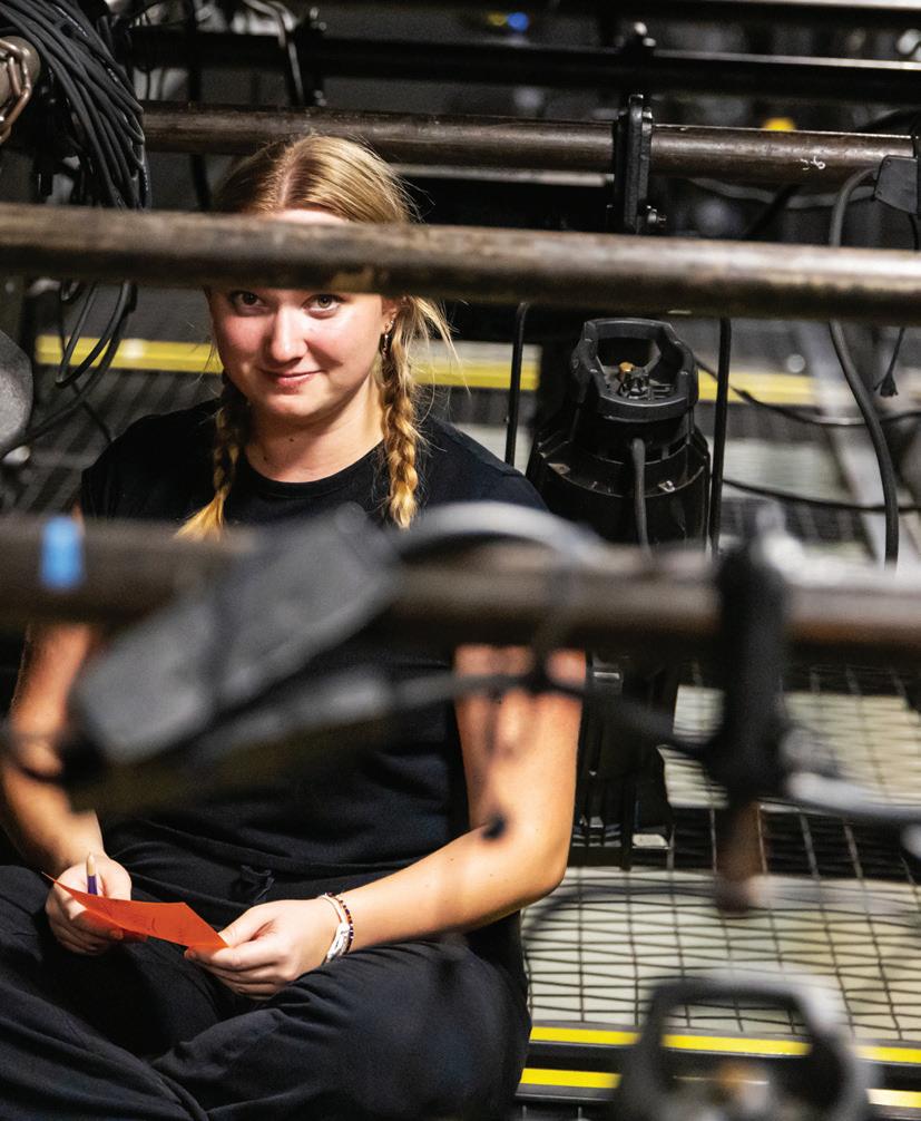 Wellesley Girl, 2024: Calling stage manager Abby Bowling in the booth. Hannah Carstarphen and Reid Williams onstage. 3 Violet, 2025: (L to R) Kirsten Estes, Kara Anne Smith, Evie Slaughenhoup, Alaya Young, Ashleigh Vickery, Patrick Barnett, Morgan McKenzie. 4 “Falling (Down)” from Flying/Falling, 2024: (L to R) Marielle Burque, Liz Koifman, Samantha Richardson. 5 Orlando, 2025: Daisha Flint and Harrison Dunn. 6, 7 Ordinary Days, 2024: (Onstage, top) Jeb Bethel, Michaela Williams; (bottom) Hali Everette, Wil Eplett, Catherine Govignon. Props coordinator Kate Nymark on the tension grid ready to drop flyers over the stage. Opposite page: A Will Johnson checking electrical equipment. B Student designer Linne Johnston examining costume stock; C Jason Owens programming LED pixel lights. All photos by Henry Eiland