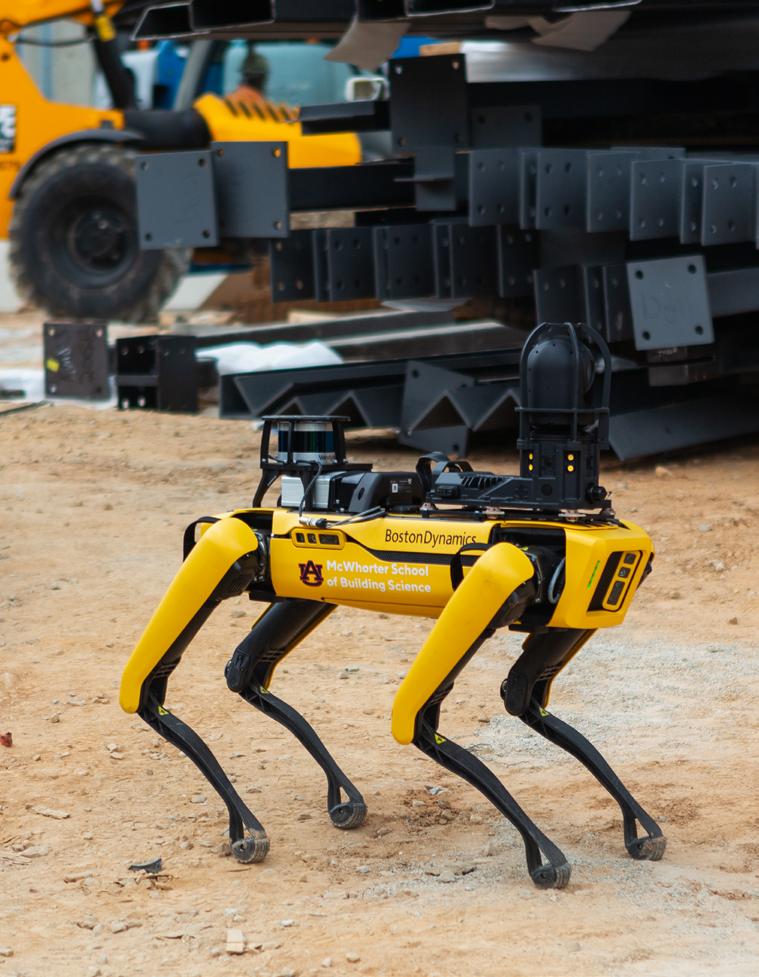 BELOW: The punchlist phase of construction is essential for ensuring quality and completeness before project turnover, but current digital platforms utilize inefficient workflows. Associate Professor Eric Wetzel, Lecturer Alexander Adolf and doctoral student Caleb Powell are exploring a human–robot collaboration system that automates punchlist generation, significantly reducing manual input and improving efficiency. The project utilizes BSCI's robotic dog, Mac, pictured here on a construction site.
