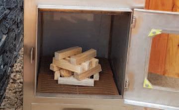 Once the fire is going, keep feeding it with dr y wood as necessar y to maintain he embers to distribute them evenly before adding more wood. Periodically stir the using the paddle on top of the lid.