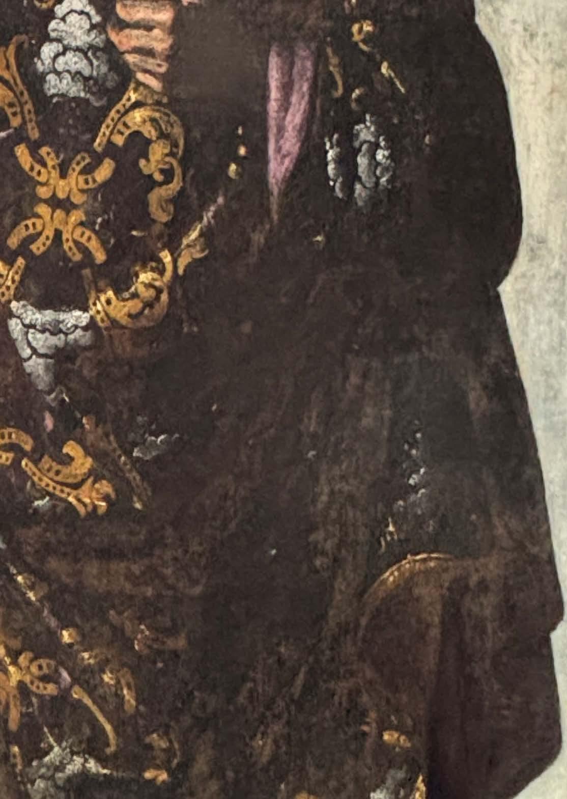 A detail from Judah’s cloak. The cleaning of the paintings has been a complicated process made more difficult by the fusing of the paint and varnish layers in some areas. This is likely because the paintings were relined before the removal of the discoloured varnish and is particularly visible in the light background where yellow staining can be seen. In the darker areas of the cloak in the painting of Judah, not only have areas been overcleaned and over retouched but there has also been a change in the pigments making it difficult to interpret the folds in the cloak before retouching has been carried out in this most recent treatment.