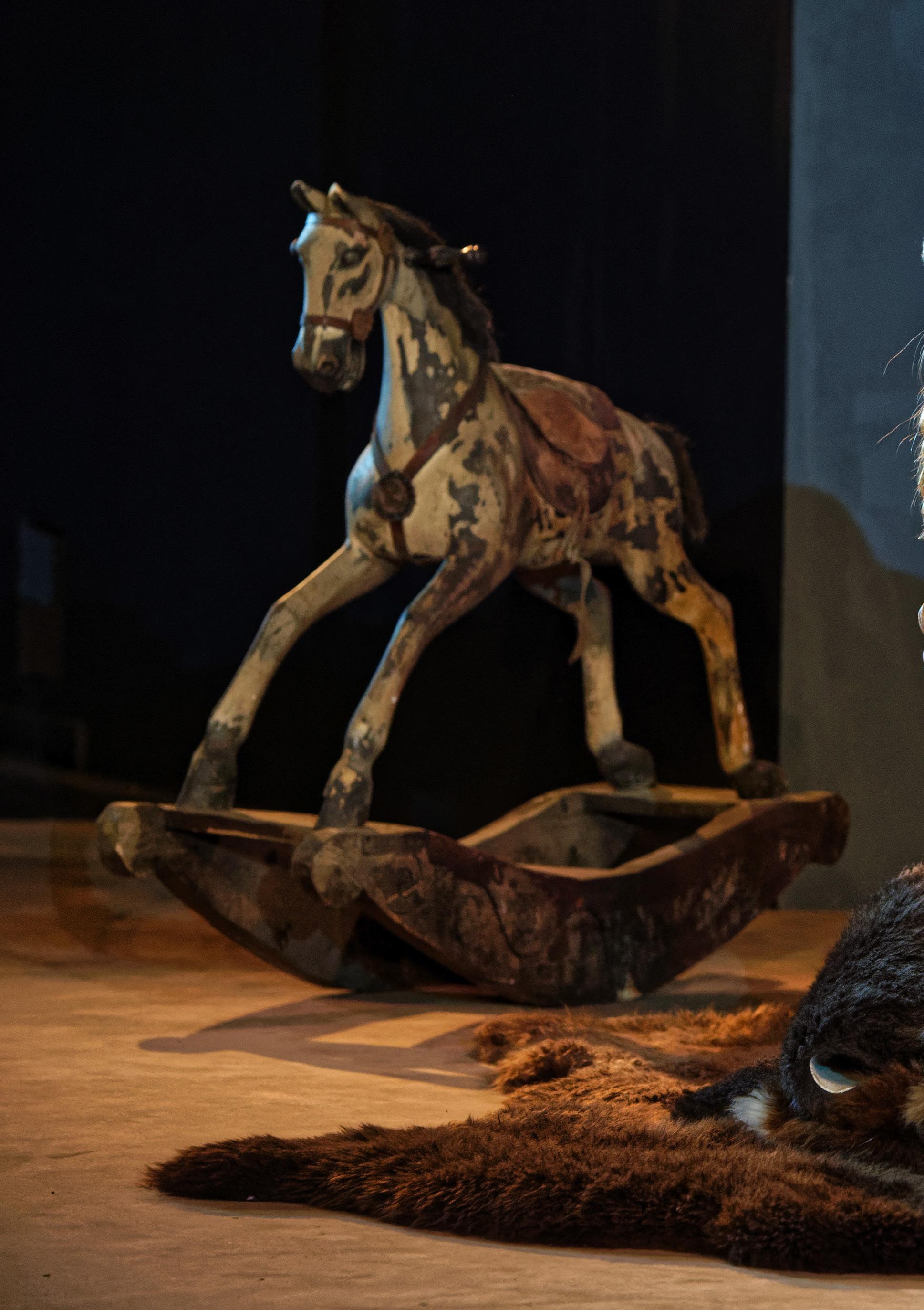 Practical seating in the form of benches sit between the doorways but otherwise stage furniture is also minimal, and emblematic, giving an indication of each location. In Act One there’s a rocking horse and writing desk in the playroom, and a pile of sheepskin rugs on the floor.