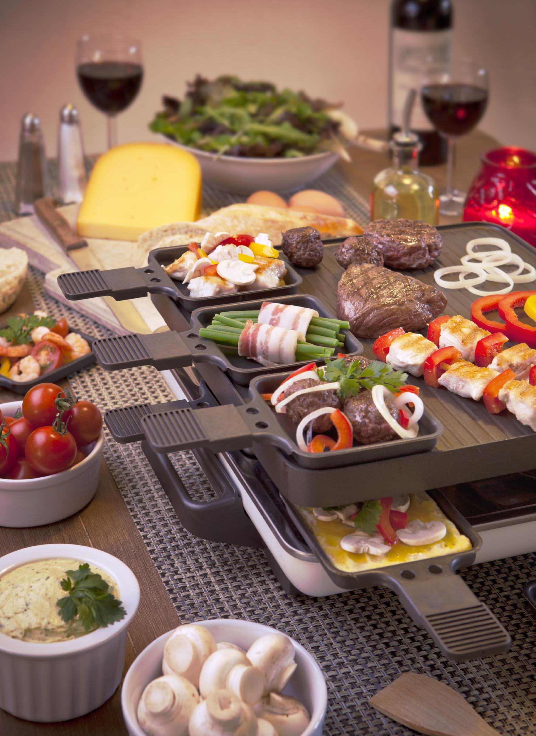 Waarom alleen vlees en vis? Zet ook een schaaltje halloumi op tafel of laat mensen hun eigen minitosti maken met kaas, ham en pesto. Of wat dacht je van een dessertpannetje met banaan, Nutella en marshmallows?