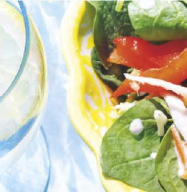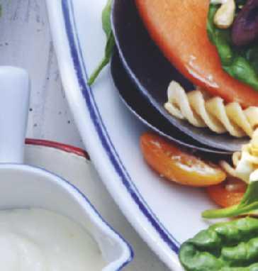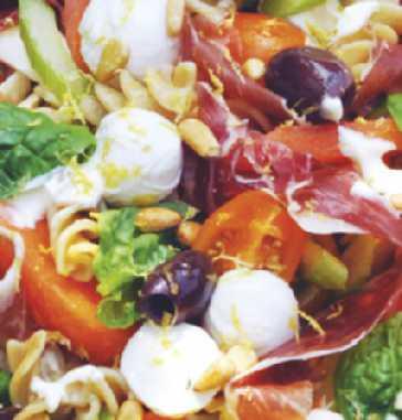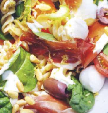 Breng op smaak met peper en zout. • Meng de pasta met de dressing, bleekselderij, tomaatjes, mozzarella, olijven en spinazie. • Verdeel over een schaal en leg er plakken ham en meloen tussen. Bestrooi met pijnboompitten en garneer met blaadjes basilicum.
