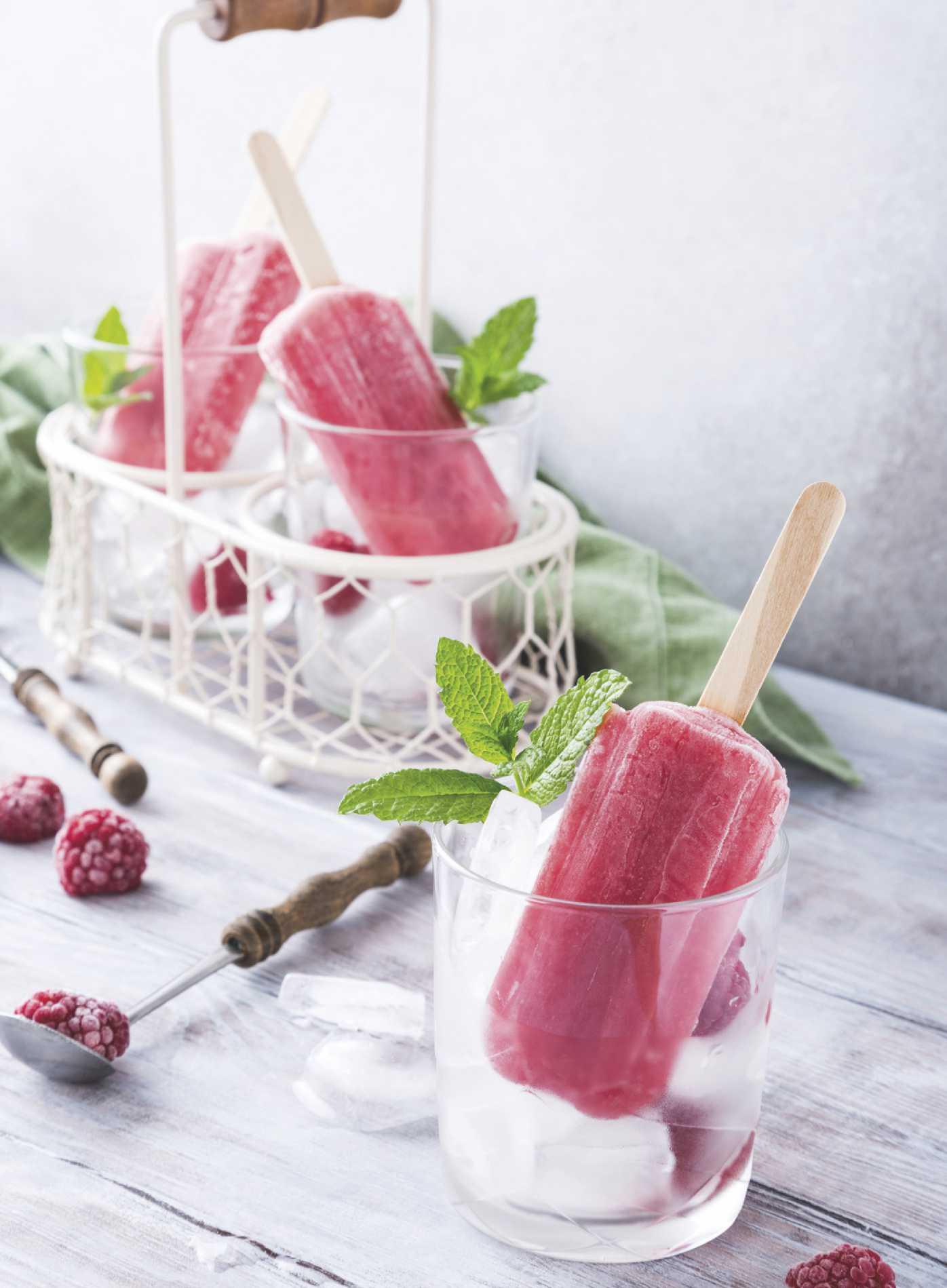 Pureer 200 gram frambozen met 225 ml water. Zeef eventueel de pitjes eruit. Roer hier 2 eetlepels honing en 35 ml grenadine door, en vul zes ijsvormpjes met dit mengsel.