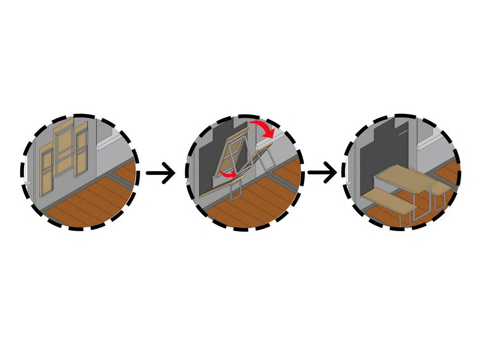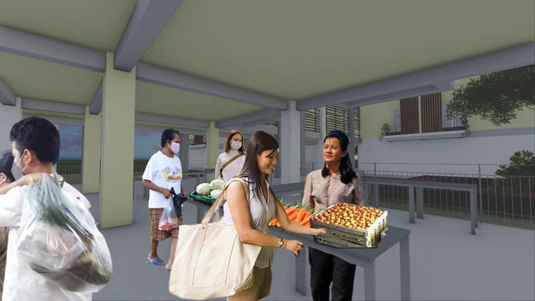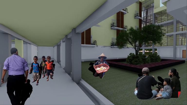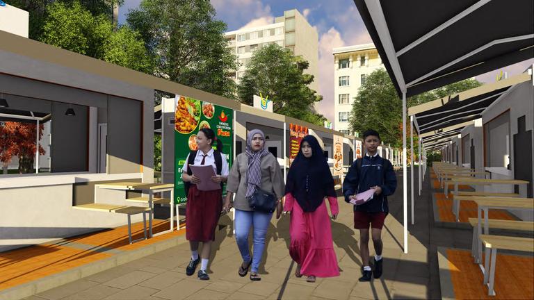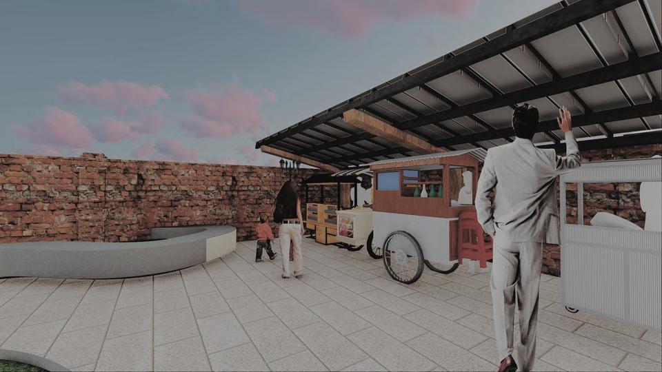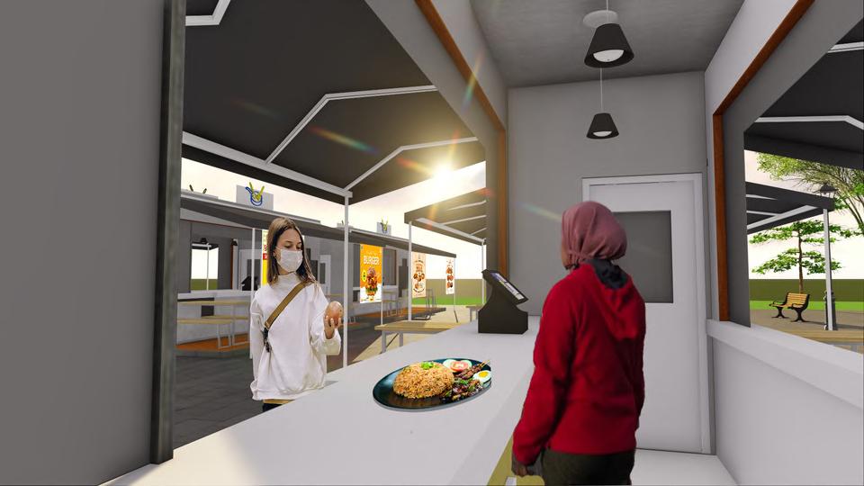 The module measuring 6.00 x 1.60 can be extended to 6.00 x 4.40 when it is in use (seller's operating hours) by using a folding system so that it forms a box and can save storage space. The current Covid-19 pandemic condition that requires maintaining distance is applied with a flexible module at the food stall which can be arranged according to needs. This is also made easier by the modular and expandable system owned by the food stall. Interactive designs between buyers and buyers, sellers with buyers, and sellers with sellers can be felt when the module has been arranged in an environment, where sellers and buyers can interact but still comply with health protocols.